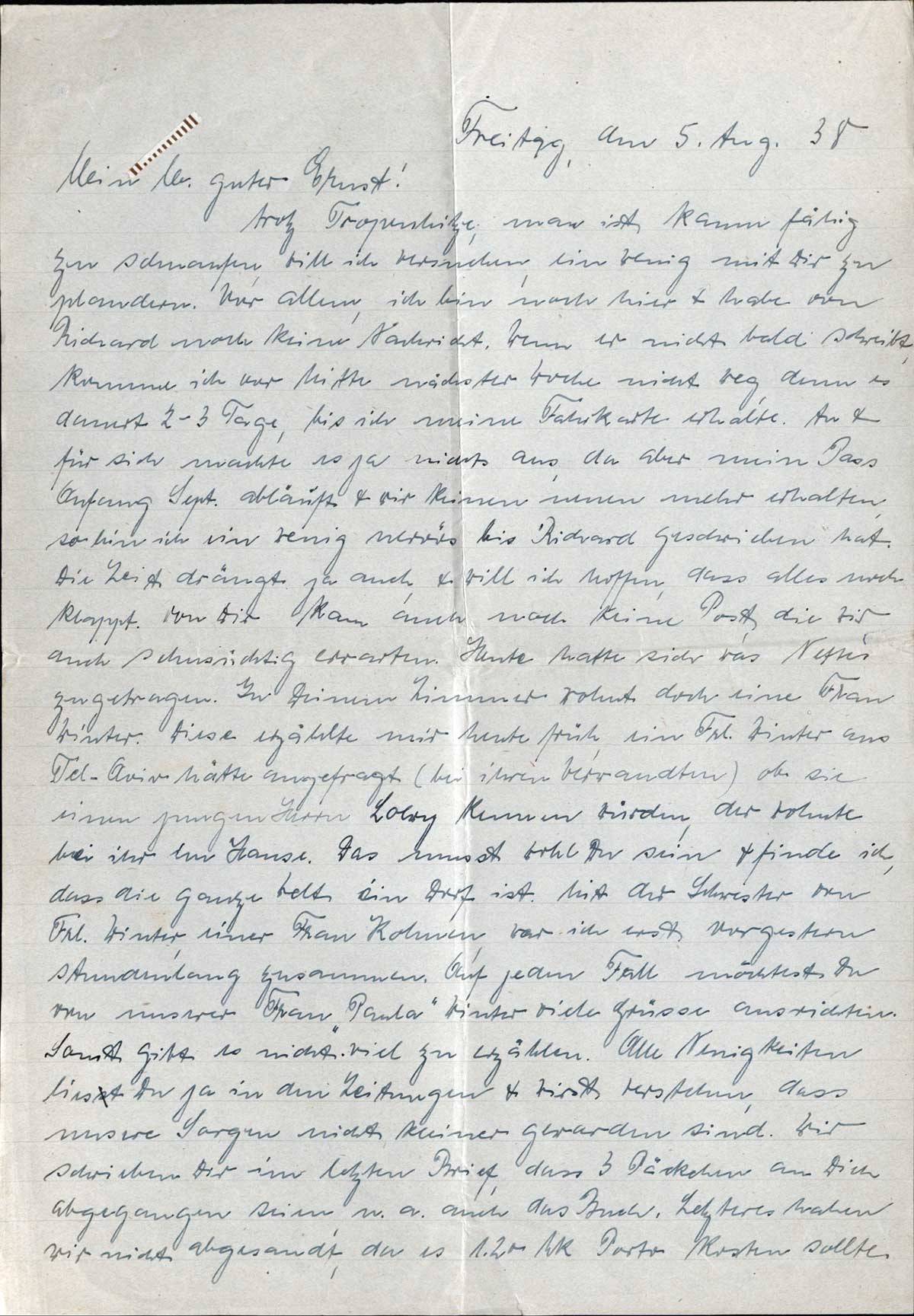 trotz Tropenhitze, man ist kaum fähig zu schnaufen, will ich versuchen, ein wenig mit Dir zu plaudern. Vor allem, ich bin noch hier & habe von Richard noch keine Nachricht. Wenn er nicht bald schreibt, komme ich vor Mitte nächster Woche nicht weg, denn es dauert 2-3 Tage, bis ich meine Fahrkarte erhalte. An & für sich machte es ja nichts aus, da aber mein Pass Anfang Sept. abläuft & wir keinen neuen mehr erhalten, so bin ich ein wenig nervös bis Richard geschrieben hat. Die Zeit drängt ja auch, & will ich hoffen, dass alles noch klappt. Von Dir kam auch noch keine Post, dir wir auch sehnsüchtig erwarten. Heute hatte sich was Nettes zugetragen. In Deinem Zimmer wohnt doch eine Frau Winter. Diese erzählte mir heute früh, ein Frl. Winter aus Tel-Aviv hätte angefragt (bei ihren Verwandten) ob sie einen jungen Herrn Loewy kennen würden, der wohnte bei ihr im Hause. Das musst wohl Du sein & finde ich, dass die ganze Welt ein Dorf ist. Mit der Schwester von Frl. Winter, einer Frau Kohnen, war ich erst vorgestern stundenlang zusammen. Auf jeden Fall möchtest Du von unserer Frau „Paula” Winter viele Grüsse ausrichten. Sonst gibt es nicht viel zu erzählen. Alle Neuigkeiten liest Du ja in den Zeitungen & wirst verstehen, dass unsere Sorgen nicht kleiner geworden sind. Wir schrieben Dir im letzten Brief, dass 3 Päckchen an Dich abgegangen seien, u. a. auch das Buch. Letzteres haben wir nicht abgesandt, da es 1.20 Mk Porto kosten sollte.