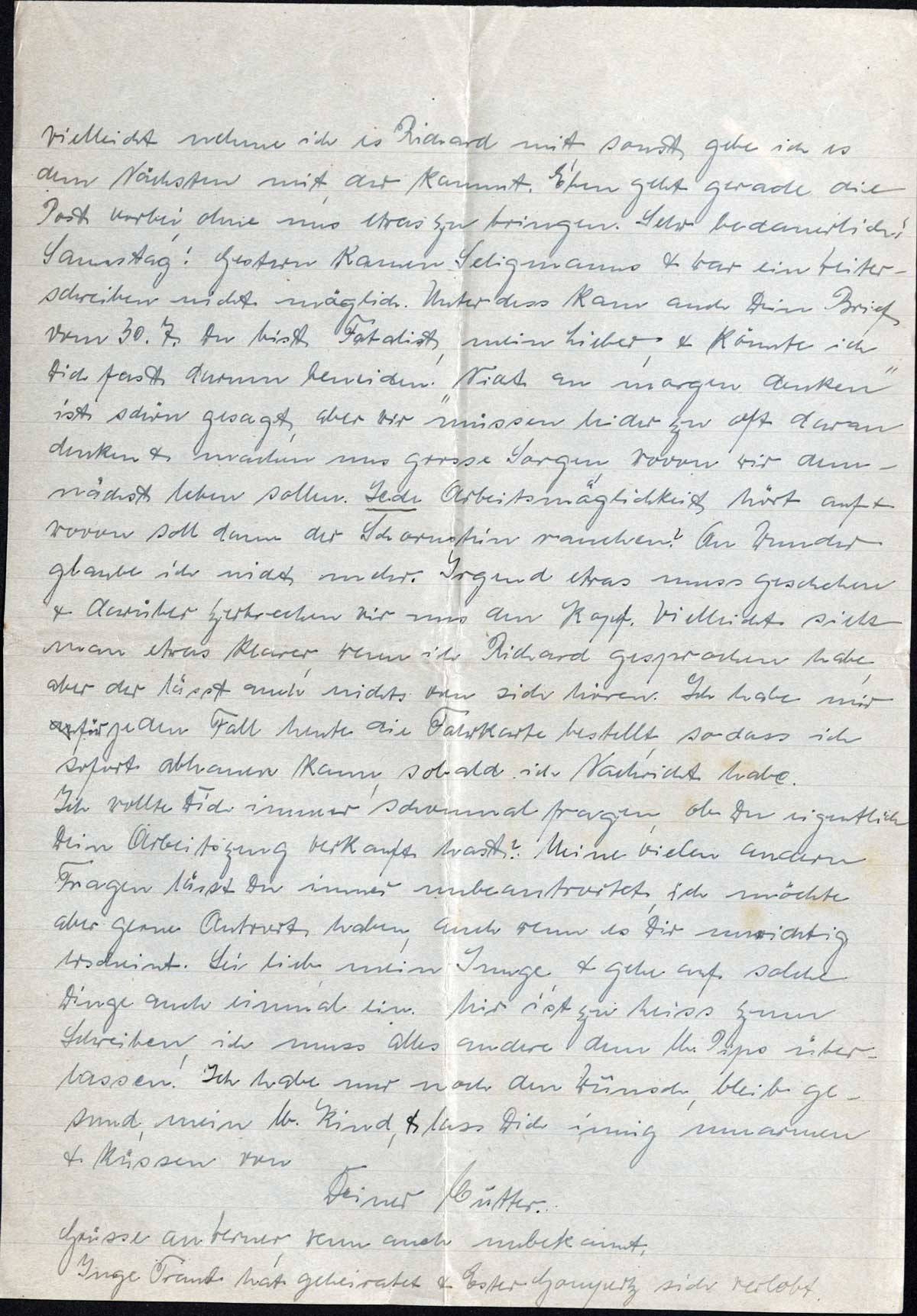 Samstag! Gestern kamen Seligmanns & war ein Weiterschreiben nicht möglich. Unterdess kam auch Dein Brief vom 30.7. Du bist Fatalist, mein Lieber, & könnte ich Dich fast darum beneiden. „Nicht an morgen denken” ist schön gesagt, aber wir müssen leider zu oft daran denken & machen uns grosse Sorgen, wovon wir demnächst leben sollen. Jede Arbeitsmöglichkeit hört auf & wovon soll dann der Schornstein rauchen? An Wunder glaube ich nicht mehr. Irgend etwas muss geschehen & darüber zerbrechen wir uns den Kopf. Vielleicht sieht man etwas klarer, wenn ich Richard gesprochen habe, aber der lässt auch nichts von sich hören. Ich habe mir für jeden Fall heute die Fahrkarte bestellt, sodass ich sofort abhauen kann, sobald ich Nachricht habe.
