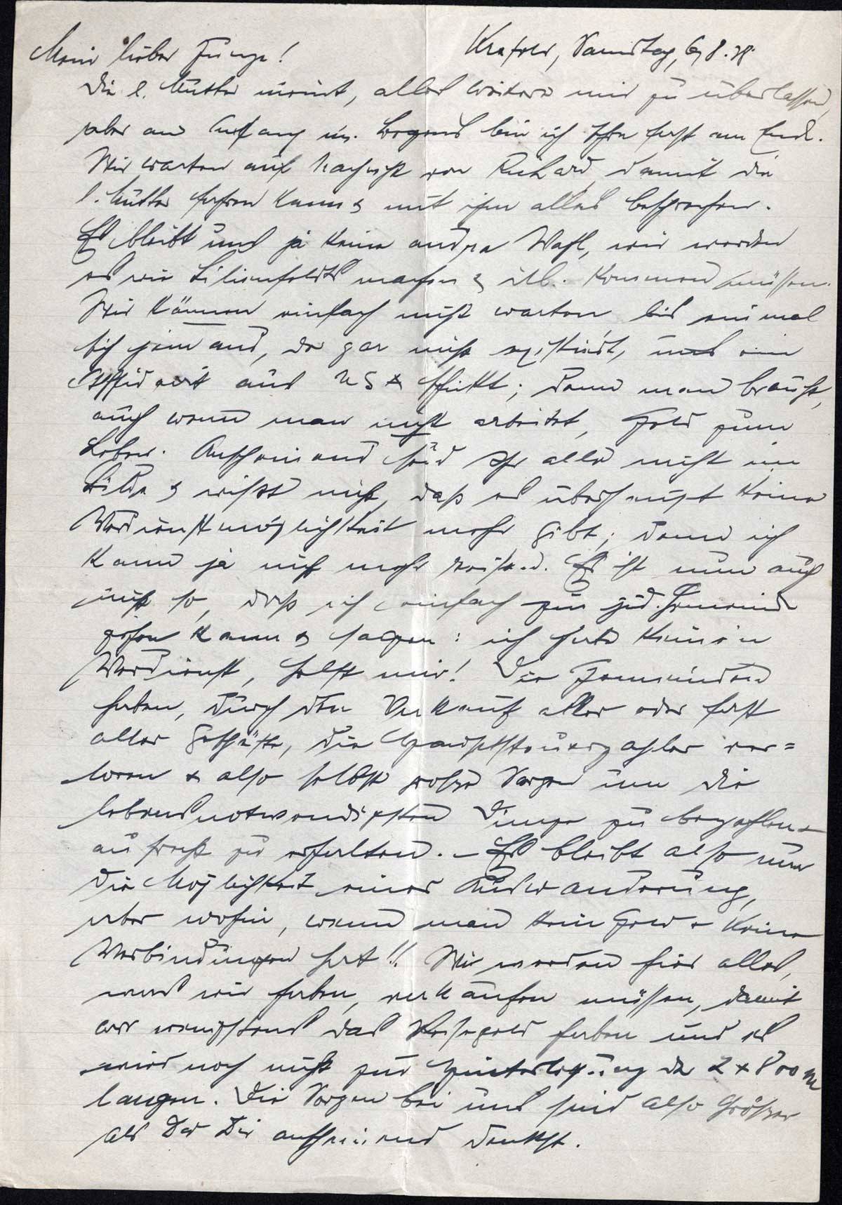 Die l. Mutter meint, alles weitere mir zu überlassen, aber am Anfang m. Bogens bin ich schon fast am Ende. Wir warten auf Nachricht von Richard, damit die l. Mutter fahren kann & mit ihm alles besprechen. Es bleibt uns ja keine andre Wahl, wir werden es wie Lilienfeldts machen & ill. kommen müssen. Wir können einfach nicht warten, bis einmal sich jemand, der gar nicht existiert, uns ein Affidavit aus USA schickt; denn man braucht, auch wenn man nicht arbeitet, Geld zum Leben. Anscheinend seid Ihr alle nicht im Bilde & wißt nicht, daß es überhaupt keine Verdienstmöglichkeit mehr gibt; denn ich kann ja nicht mehr reisen. Es ist nun auch nicht so, daß ich einfach zur jüd. Gemeinde gehen kann & sagen: ich habe keinen Verdienst, helft mir! Die Gemeinden haben, durch den Verkauf aller oder fast aller Geschäfte, die Grundsteuerzahler verloren & also selbst große Sorgen um die lebensnotwendigen Dinge zu bezahlen & aufrecht zu erhalten. - Es bleibt also nur die Möglichkeit einer Auswanderung, aber wohin, wenn man kein Geld & keine Verbindungen hast!! Wir werden hier alles, was wir haben, verkaufen müssen, damit wir wenigstens das Reisegeld haben und es wird noch nicht zur Hinterlegung der 2 x 800 Mk langen. Die Sorgen bei uns sind also größer als Du Dir anscheinend denkst.