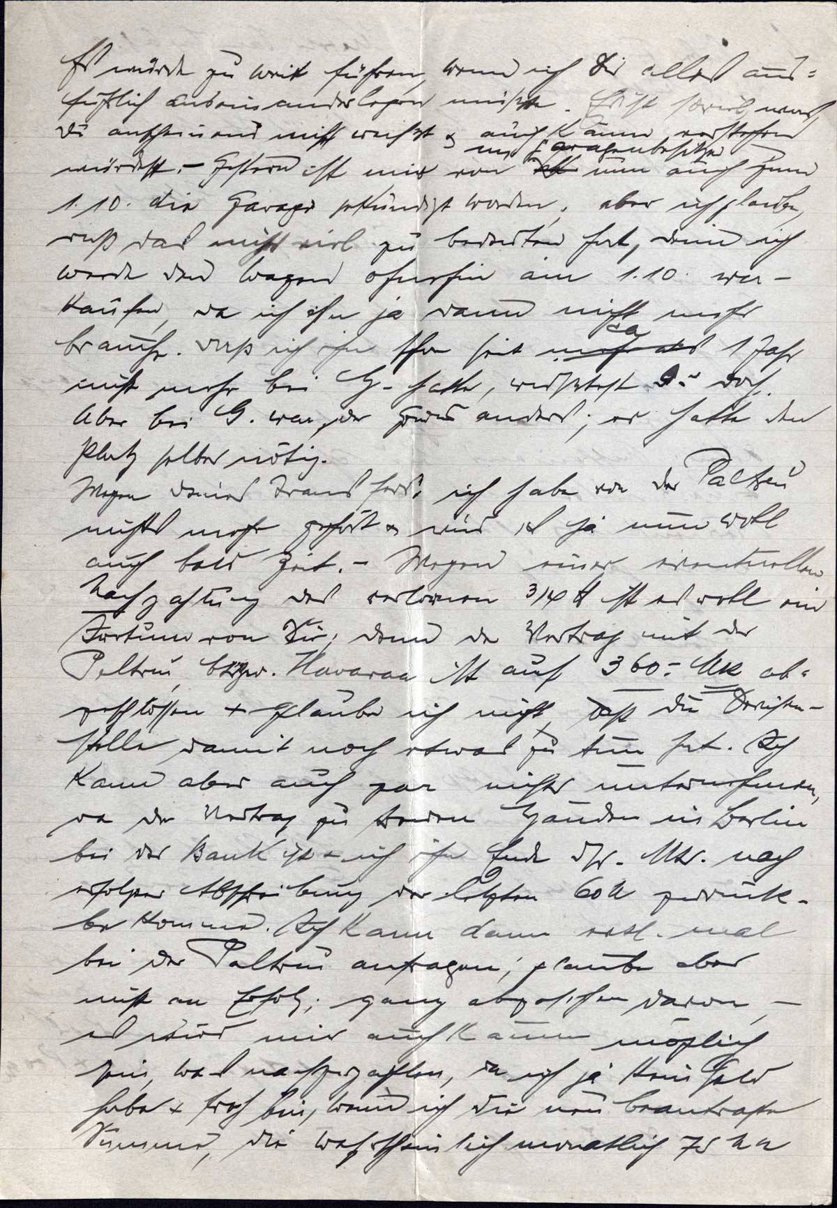 Es würde zu weit führen, wenn ich Dir alles ausführlich auseinanderlegen müßte. Es ist soviel, was Du anscheinend nicht weißt & auch kaum verstehen würdest. - Gestern ist mir von m. Garagenbesitzer nun auch zum 1.10. die Garage gekündigt worden; aber ich glaube, daß das nicht viel zu bedeuten hat, denn ich werde den Wagen ohnehin am 1.10. verkaufen, da ich ihn ja dann nicht mehr brauche. Daß ich ihn schon seit ca 1 Jahr nicht mehr bei G. hatte, verstehst Du doch. Aber bei G. war der Grund anders; er hatte den Platz selber nötig.