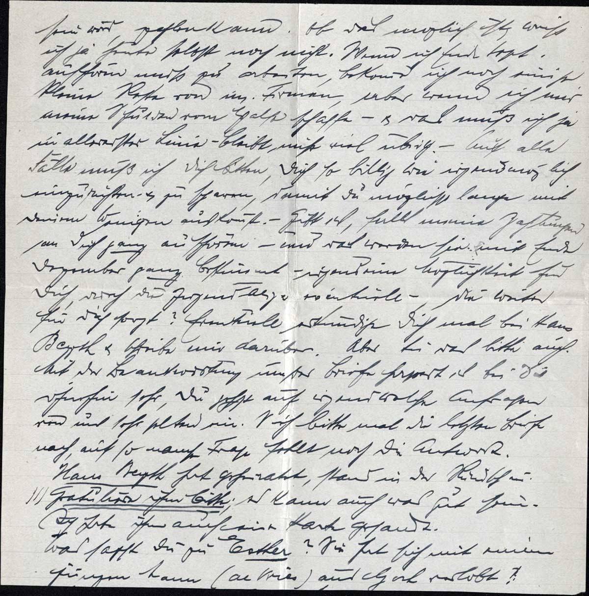 sein wird, zahlen kann. Ob das möglich ist, weiß ich ja heute selbst noch nicht. Wenn ich Ende Sept. aufhören muß zu arbeiten, bekomme ich noch einige kleine Reste von m. Firmen, aber wenn ich mir meine Schulden vom Halse schaffe - & das muß ich ja in allererster Linie - bleibt nicht viel übrig. - Auf alle Fälle muß ich Dich bitten, Dich so billig wie irgendmöglich einzurichten & zu sparen, damit Du möglichst lange mit Deinem Wenigen auskommst. - Gibt es, falls meine Zahlungen an Dich ganz aufhören - und das werden sie mit Ende Dezember ganz bestimmt - irgendeine Möglichkeit für Dich, durch die Jugendalijah eventuell -, die weiter für Dich sorgt? Eventuell erkundige Dich mal bei Hans Beyth & schreibe mir darüber. Aber tu das bitte auch. Mit der Beantwortung unsrer Briefe hapert es bei Dir ohnehin sehr, Du gehst auf irgendwelche Anfragen von uns sehr selten ein. Sieh bitte mal die letzten Briefe nach, auf so manche Frage fehlt noch die Antwort.