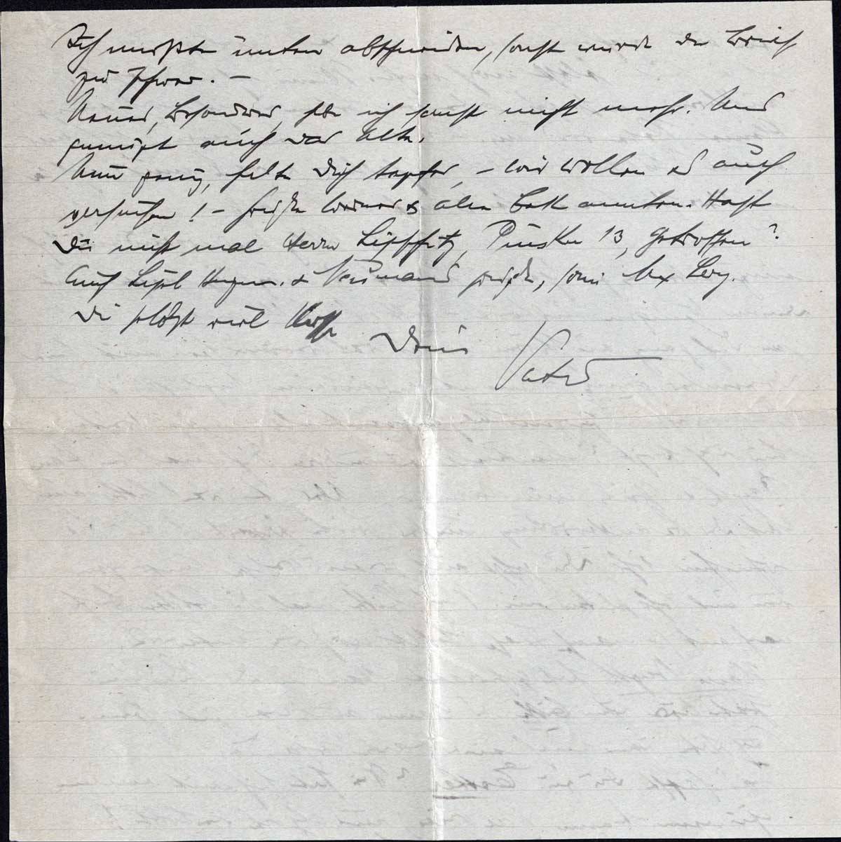 Nun genug, halte Dich tapfer, - wir wollen es auch versuchen! - Grüße Werner & alle Bekannten. Hast Du nicht mal Herrn Lipschitz, Piusker 13, getroffen? Auch Seppel Herzm. & Neumanns grüße, sowie Max Levy.