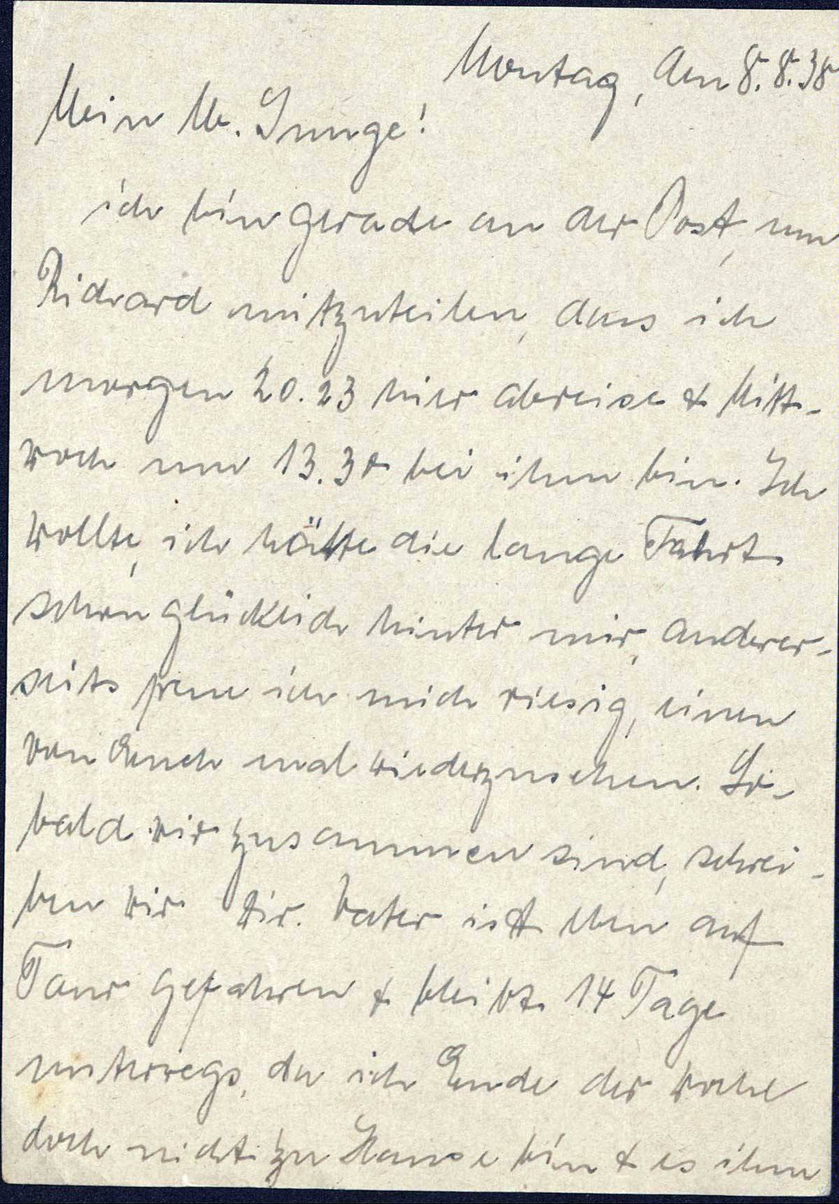 ich bin gerade an der Post, um Richard mitzuteilen, dass ich morgen 20.23 hier abreise & Mittwoch um 13.30 bei ihm bin. Ich wollte, ich hätte die lange Fahrt schon glücklich hinter mir, andererseits freu ich mich riesig, einen von Euch mal wiederzusehen. Sobald wir zuammen sind, schreiben wir Dir. Vater ist eben auf Tour gefahren & bleibt 14 Tage unterwegs, da ich Ende der Woche doch nicht zu Hause bin & es ihm