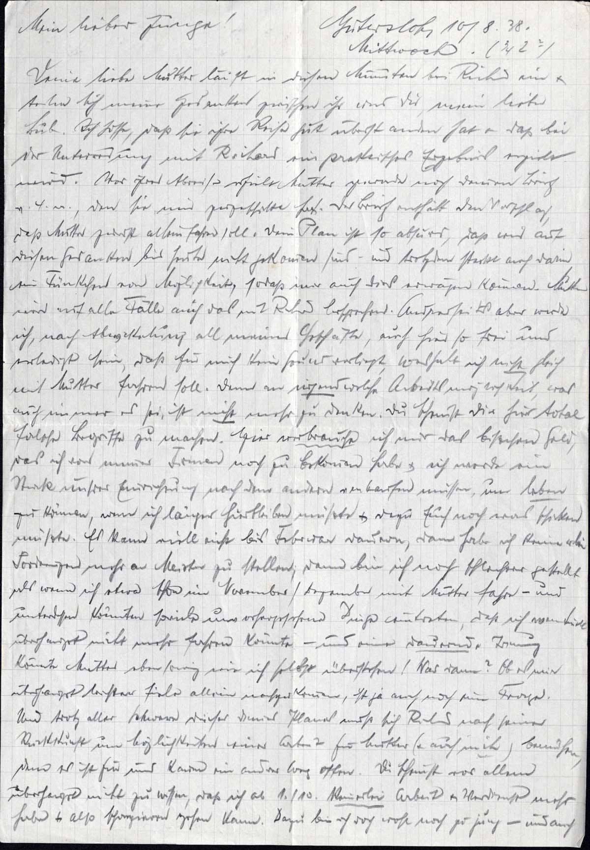 Deine liebe Mutter läuft in diesen Minuten bei Richard ein & teilen sich meine Gedanken zwischen ihr und Dir, mein lieber Bub. Ich hoffe, daß sie ihre Reise gut überstanden hat & daß bei der Unterredung mit Richard ein praktisches Ergebnis erzielt wird. Vor ihrer Abreise erhielt Mutter gerade noch Deinen Brief v. 4. ds., den sie mir zugeschickt hat. Der Brief enthält den Vorschlag, daß Mutter zuerst allein fahren soll. Dein Plan ist so absurd, daß wir auf diesen Gedanken bis heute nicht gekommen sind - und trotzdem steckt auch darin ein Fünkchen von Möglichkeit, sodaß wir auch dies erwägen können. Mutter wird auf alle Fälle auch das mit Richard besprechen. Andrerseits aber werde ich, nach Abwicklung all meiner Geschäfte, auch hier so frei und erledigt sein, daß für mich kein Grund vorliegt, weshalb ich nicht gleich mit Mutter fahren soll. Denn an irgendwelche Arbeitsmöglichkeit, was auch immer es sei, ist nicht mehr zu denken. Du scheinst Dir hier total falsche Begriffe zu machen. Hier verbrauche ich nur das bißchen Geld, das ich von meinen Firmen noch zu bekommen habe & ich werde ein Stück unsrer Einrichtung nach dem andern verkaufen müssen, um leben zu können, wenn ich länger hierbleiben müßte & dazu Euch noch was schicken müßte. Es kann vielleicht bis Februar dauern, dann habe ich keinerlei Forderungen mehr an Meister zu stellen; dann bin ich noch schlechter gestellt als wenn ich etwa schon im November/Dezember mit Mutter fahre - und unterdessen könnten soviele unvorhergesehenen Dinge eintreten, daß ich eventuell überhaupt nicht mehr fahren könnte - und eine dauernde Trennung könnte Mutter ebensowenig wie ich selbst überstehen! Was dann! Ob es mir überhaupt leichter fiele allein nachzukommen, ist ja auch noch eine Frage. Und trotz aller Schwere dieses Deines Planes muß sich Richard nach seiner Rückkunft um Möglichkeiten einer Arbeit für Mutter (& auch mich), bemühen, denn es ist für uns kaum ein andrer Weg offen. Du scheinst vor allem überhaupt nicht zu wissen, daß ich ab 1./10. keinerlei Arbeit & Verdienst mehr habe & also spazieren gehen kann. Dazu bin ich doch wohl noch zu jung - und auch