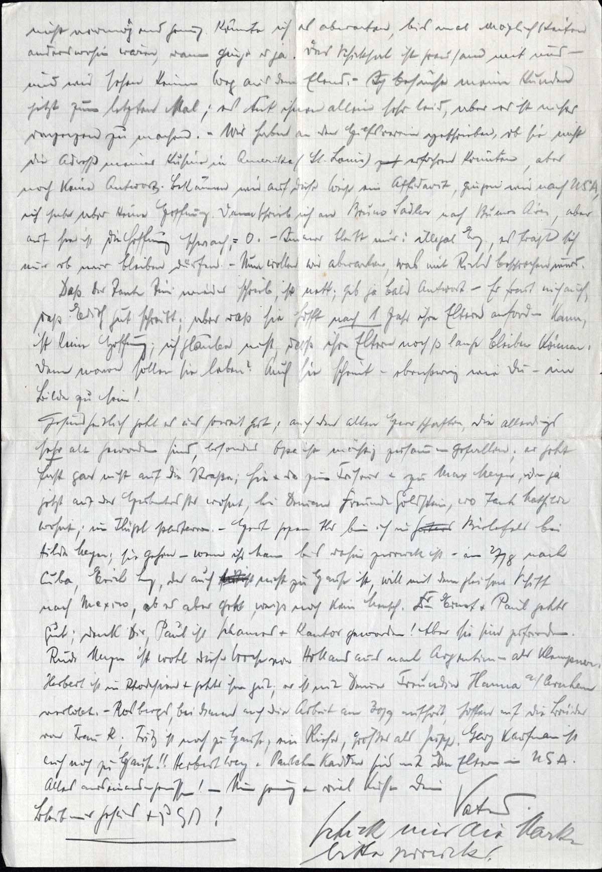 Gesundheitlich geht es uns soweit gut; auch den alten Herrschaften, die allerdings sehr alt geworden sind, besonders Opa ist mächtig zusammengefallen; er geht fast gar nicht auf die Straße; hie & da zum Friseur & zu Max Meyer, der ja jetzt auf der Hubertusstr. wohnt, bei Deinem Freunde Goldstein, wo Tante Mathilde wohnt, im [..] parterre. - Heute gegen Abd bin ich in Bielefeld bei Hilde Meyer; sie gehen - wenn ihr Mann bis dahin zurück ist - am 27/8 nach Cuba, Erich Ley, der auch nicht zu Hause ist, will mit dem gleichen Schiff nach Mexico, ob es aber geht, weiß noch kein Mensch. Dr. Ernst & Paul gehts gut; denk Dir, Paul ist [..] & Kantor geworden! Aber sie sind zufrieden. Rudi Meyer ist wohl diese Woche von Holland aus nach Argentinien - als Klempner. Herbert ist in Rhodesien & gehts ihm gut; er ist mit Deiner Freundin Hanna a./Arnheim verlobt. - Rosbergs, bei denen auch die Arbeit am 30/9 aufhört, hoffen auf die Brüder von Frau R.; Fritz ist noch zu Hause; ein Riese, größer als Jupp. Gerg Kaufmann ist auch noch zu Hause!! Herbert Wey & Ualchen Kadden sind mit den Eltern in USA. Alles auseinandergerissen! - Nun genug & viel Küsse Dein