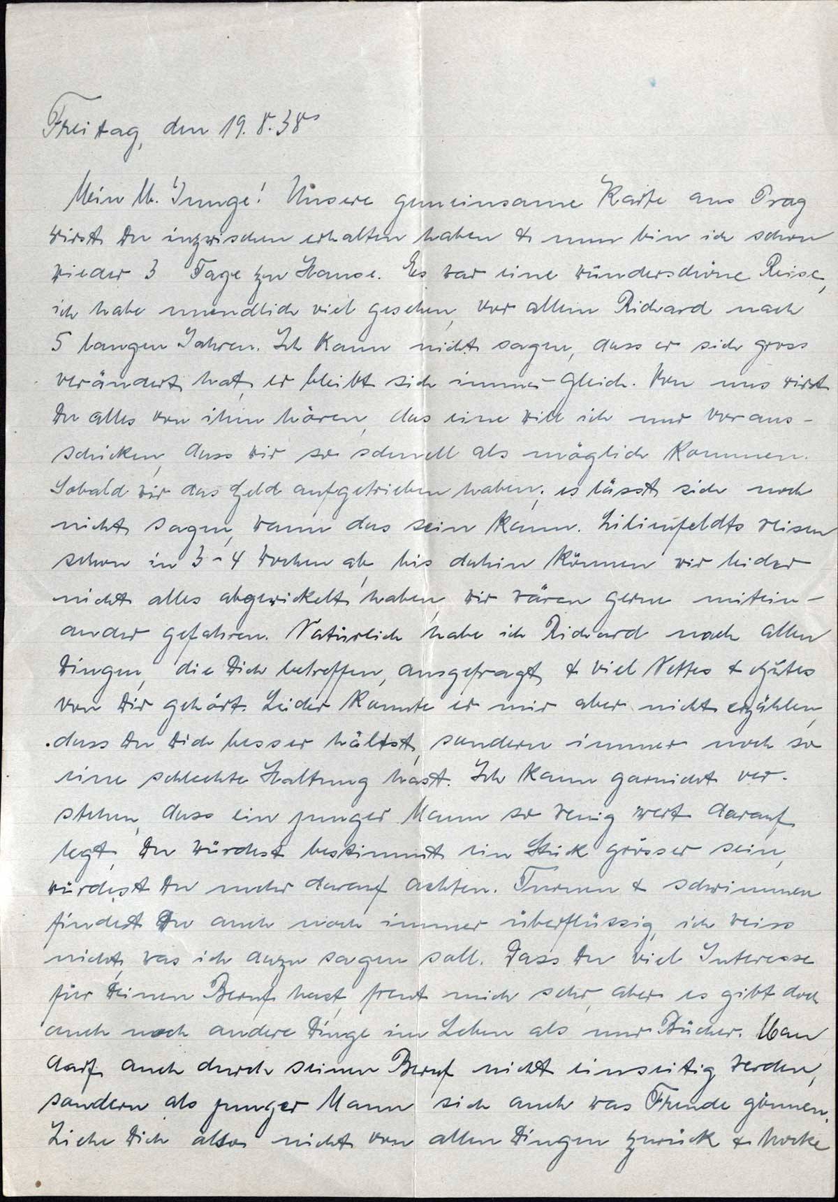 Mein lb. Junge! Unsere gemeinsame Karte aus Prag wirst Du inzwischen erhalten haben & nun bin ich schon wieder 3 Tage zu Hause. Es war eine wunderschöne Reise, ich habe unendlich viel gesehen, vor allem Richard nach 5 langen Jahren. Ich kann nicht sagen, dass er sich gross verändert hat, er bleibt sich immer gleich. Von uns wirst Du alles von ihm hören, das eine will ich nur vorausschicken, dass wir so schnell als möglich kommen. Sobald wir das Geld aufgetrieben haben; es lässt sich noch nicht sagen, wann das sein kann. Lilienfeldts reisen schon in 3-4 Wochen ab, bis dahin können wir leider nicht alles abgewickelt haben, wir wären gern miteinander gefahren. Natürlich habe ich Richard nach allen Dingen, die Dich betreffen, ausgefragt & viel Nettes & Gutes von Dir gehört. Leider konnte er mir aber nicht erzählen, dass Du Dich besser hältst, sondern immer noch so eine schlechte Haltung hast. Ich kann garnicht verstehen, dass ein junger Mann so wenig Wert darauf legt. Du würdest bestimmt ein Stück grösser sein, würdest Du mehr darauf achten. Turnen & schwimmen findest Du auch noch immer überflüssig, ich weiss nicht, was ich dazu sagen soll. Dass Du viel Interesse für Deinen Beruf hast, freut mich sehr, aber es gibt doch auch noch andere Dinge im Leben als nur Bücher. Man darf auch durch seinen Beruf nicht einseitig werden, sondern als junger Mann sich auch was Freude gönnen. Ziehe dich also nicht von allen Dingen zurück & hocke