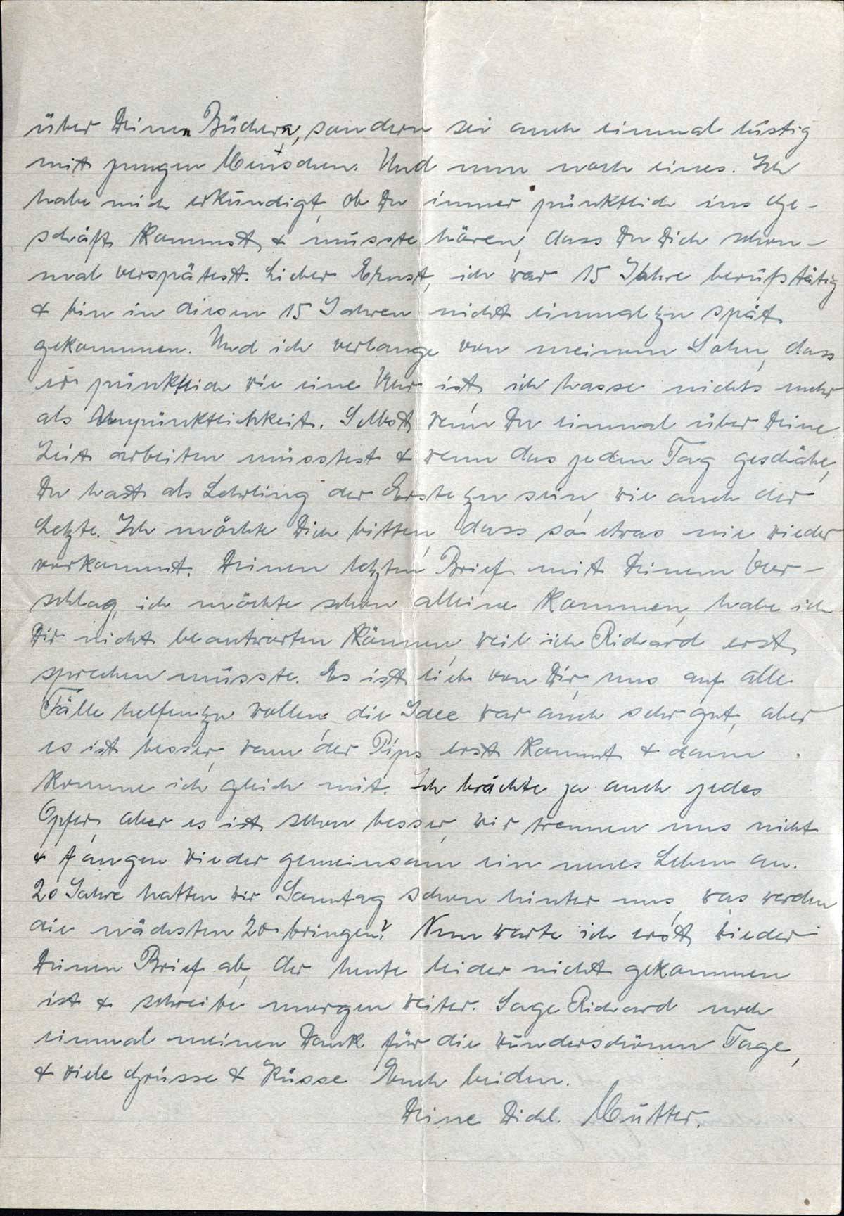über Deinen Büchern, sondern sei auch einmal lustig mit jungen Menschen. Und nun noch eines. Ich habe mich erkundigt, ob Du immer pünktlich ins Geschäft kommst & musste hören, dass Du Dich schonmal verspätest. Lieber Ernst, ich war 15 Jahre berufstätig & bin in diesen 15 Jahren nicht einmal zu spät gekommen. Und ich verlange von meinem Sohn, dass er pünktlich wie eine Uhr ist, ich hasse nichts mehr als Unpünktlichkeit. Selbst wenn Du einmal über Deine Zeit arbeiten musstest & wenn das jeden Tag geschähe, Du hast als Lehrling der Erste zu sein, wie auch der Letzte. Ich möchte Dich bitten, dass so etwas nie wieder vorkommt. Deinen letzten Brief mit Deinem Vorschlag, ich möchte schon alleine kommen, habe ich Dir nicht beantworten können, weil ich Richard erst sprechen musste. Es ist lieb von Dir, uns auf alle Fälle helfen zu wollen, die Idee war auch sehr gut, aber es ist besser, wenn der Pips erst kommt & dann komme ich gleich mit. Ich brächte ja auch jedes Opfer; aber es ist schon besser, wir trennen uns nicht & fangen wieder gemeinsam ein neues Leben an. 20 Jahre hatten wir Sonntag schon hinter uns, was werden die nächsten 20 bringen? Nun warte ich erst wieder Deinen Brief ab, der heute leider nicht gekommen ist & schreibe morgen weiter. Sage Richard noch einmal meinen Dank für die wunderschönen Tage, & viele Grüsse & Küsse Euch beiden.