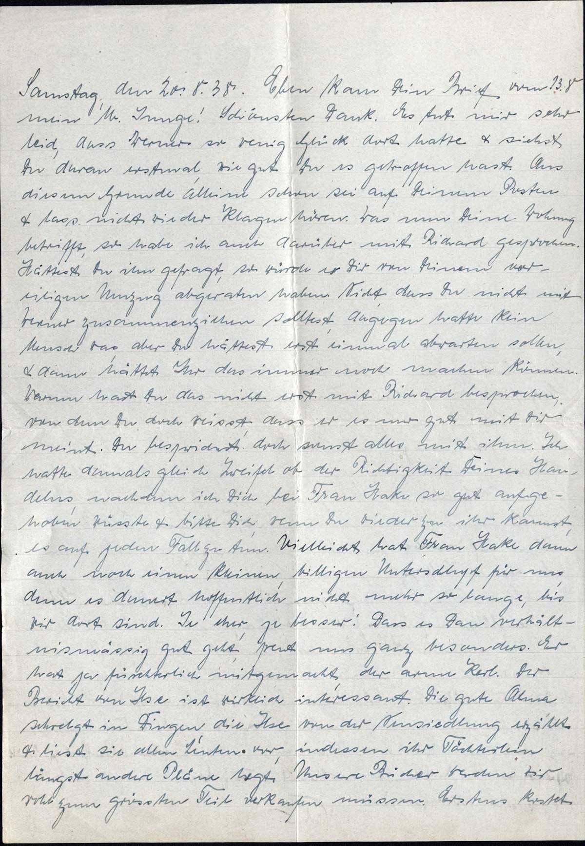 Samstag, den 20.8.38. Eben kam Dein Brief vom 13.8. mein lb. Junge! Schönsten Dank. Es tut mir sehr leid, dass Werner so wenig Glück dort hatte & siehst Du daran erstmal, wie gut Du es getroffen hast. Aus diesem Grunde alleine schon sei auf Deinem Posten & lass nicht wieder Klagen hören. Was nun Deine Wohnung betrifft, so habe ich auch darüber mit Richard gesprochen. Hättest Du ihn gefragt, so würde er Dir von Deinem voreiligen Umzug abgeraten haben. Nicht, dass Du nicht mir Werner zusammenziehen solltest, dagegen hatte kein Mensch was, aber Du hättest erst einmal abwarten sollen, & dann hättet Ihr das immer noch machen können. Warum hast Du das nicht erst mit Richard besprochen, von dem Du doch weisst, dass er es nur gut mit Dir meint. Du besprichst doch sonst alles mit ihm. Ich hatte damals gleich Zweifel ob der Richtigkeit Deines Handelns, nachdem ich Dich bei Frau Hake so gut aufgehoben wusste & bitte Dich, wenn Du wieder zu ihr kannst, es auf jeden Fall zu tun. Vielleicht hat Frau Hake dann auch noch einen kleinen, billigen Unterschlupf für uns, denn es dauert hoffentlich nicht mehr so lange, bis wir dort sind. Je eher, je besser! Dass es Dan verhältnismässig gut geht, freut uns ganz besonders. Er hat ja fürchterlich mitgemacht, der arme Kerl. Der Bericht von Ilse ist wirklich interessant. Die gute Alma schwelgt in Dingen, die Ilse von der Neusiedlung erzählt & liest sie allen Leuten vor, indessen ihr Töchterlein längst andere Pläne hegt. Unsere Bücher werden wir wohl zum grössten Teil verkaufen müssen. Erstens kostet