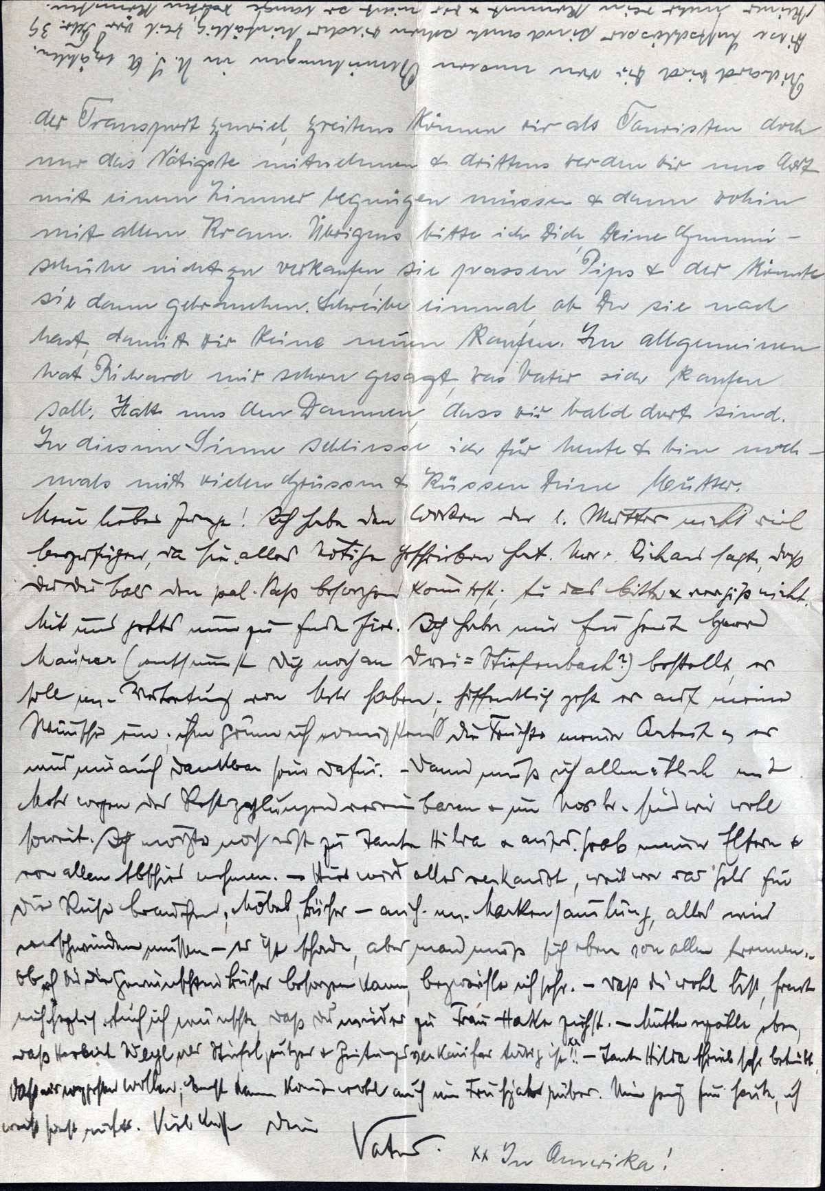 der Transport zuviel, zweitens können wir als Touristen doch nur das Nötigste mitnehmen & drittens werden wir uns dort mit einem Zimmer begnügen müssen & dann wohin mit allem Kram. Übrigens bitte ich Dich, Deine Gummischuhe nicht zu verkaufen, sie passen Pips & der könnte sie dann gebrauchen. Schreibe einmal, ob Du sie noch hast, damit wir keine neuen kaufen. Im allgemeinen hat Richard mir schon gesagt, was Vater sich kaufen soll. Halt uns den Daumen, dass wir bald dort sind. In diesem Sinne schliesse ich für heute & bin nochmals mit vielen Grüssen & Küssen Deine Mutter.