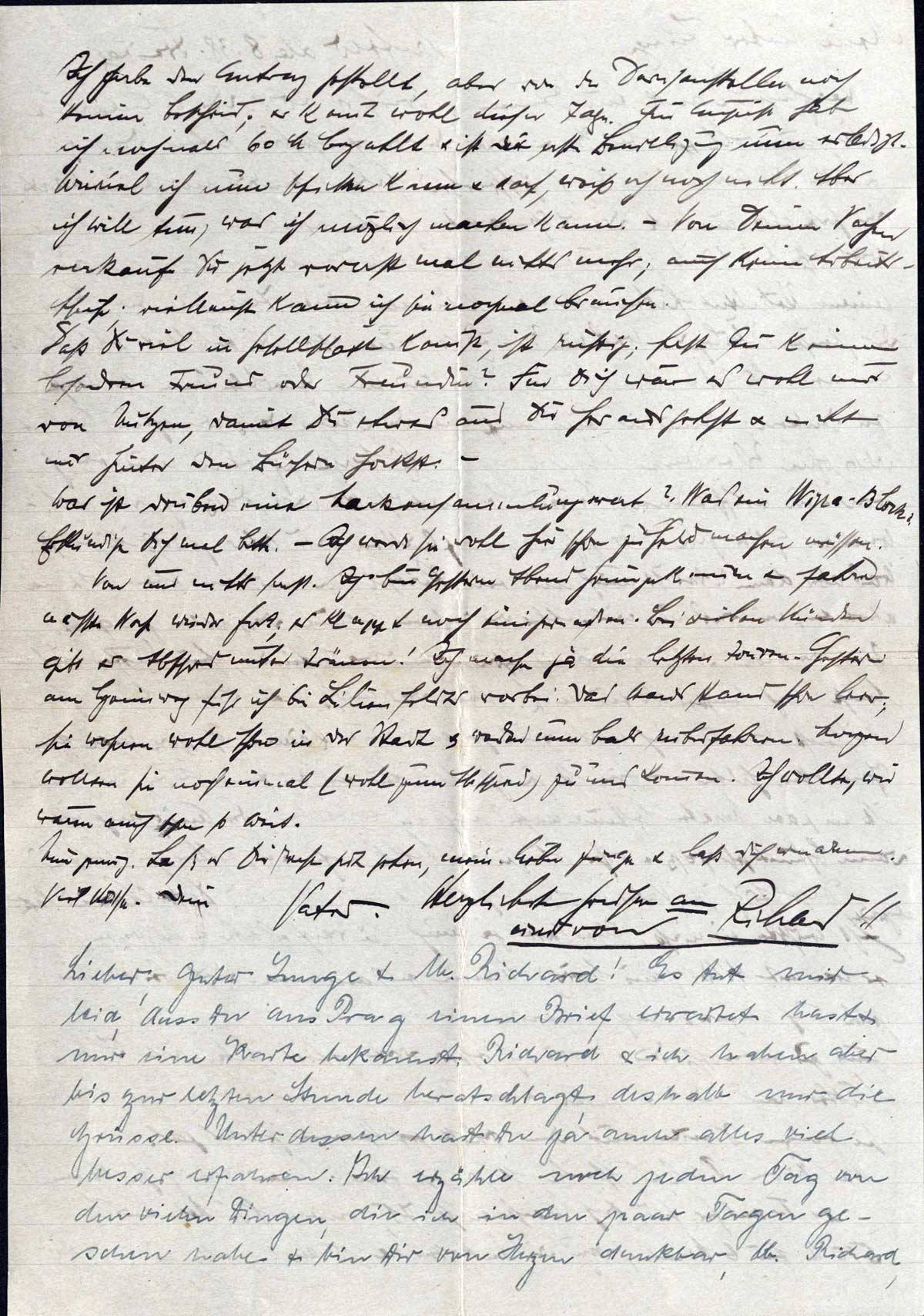 Lieber guter Junge & lb. Richard! Es tut mir leid, dass Du aus Prag einen Brief erwartet hast & nur eine Karte bekamst. Richard & ich haben aber bis zur letzten Stunde beratschlagt; deshalb nur die Grüsse. Unter dessen hast Du ja auch alles viel besser erfahren. Ich erzähle noch jeden Tag von den vielen Dingen, die ich in den paar Tagen gesehen habe & bin Dir von Herzen dankbar, lb. Richard,