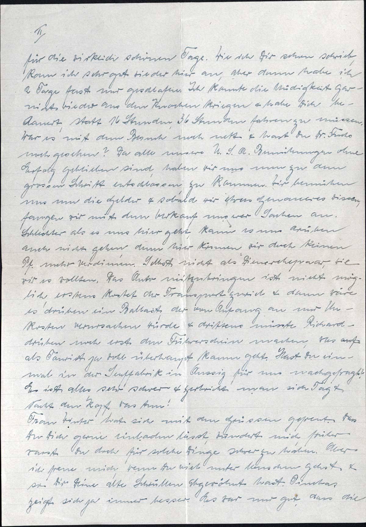 für die wirklich schönen Tage. Wie ich Dir schon schrieb, kam ich sehr gut wieder hier an, aber dann habe ich 2 Tage fast nur geschlafen. Ich konnte die Müdigkeit gar nicht wieder aus den Knochen kriegen & habe Dich bedauert, statt 16 Stunden, 36 Stunden fahren zu müssen. War es mit dem Besuch noch nett & hast Du Dr. Fuchs noch gesehen? Da alle unsere U.S.A. Bemühungen ohne Erfolg geblieben sind, haben wir uns nun zu dem grossen Schritt entschlossen, zu kommen. Wir bemühen uns um die Gelder & sobald wir etwas Genaueres wissen, fangen wir mit dem Verkauf unserer Sachen an. Schlechter als es uns hier geht, kann es uns drüben auch nicht gehen, denn hier können wir doch keinen Pf. mehr verdienen. Selbst nicht als Dienerehepaar, wie wir es wollten. Das Auto mitzubringen ist nicht möglich, erstens kostet der Transport zuviel & dann wäre es drüben ein Ballast, der von Anfang an nur Unkosten verursachen würde & drittens müsste Richard - drüben noch erst den Führerschein machen, was als Tourist ja wohl überhaupt kaum geht. Hast Du einmal in der Senffabrik in Aussig für uns nachgefragt? Es ist alles sehr schwer & zerbricht man sich Tag & Nacht den Kopf, was tun!