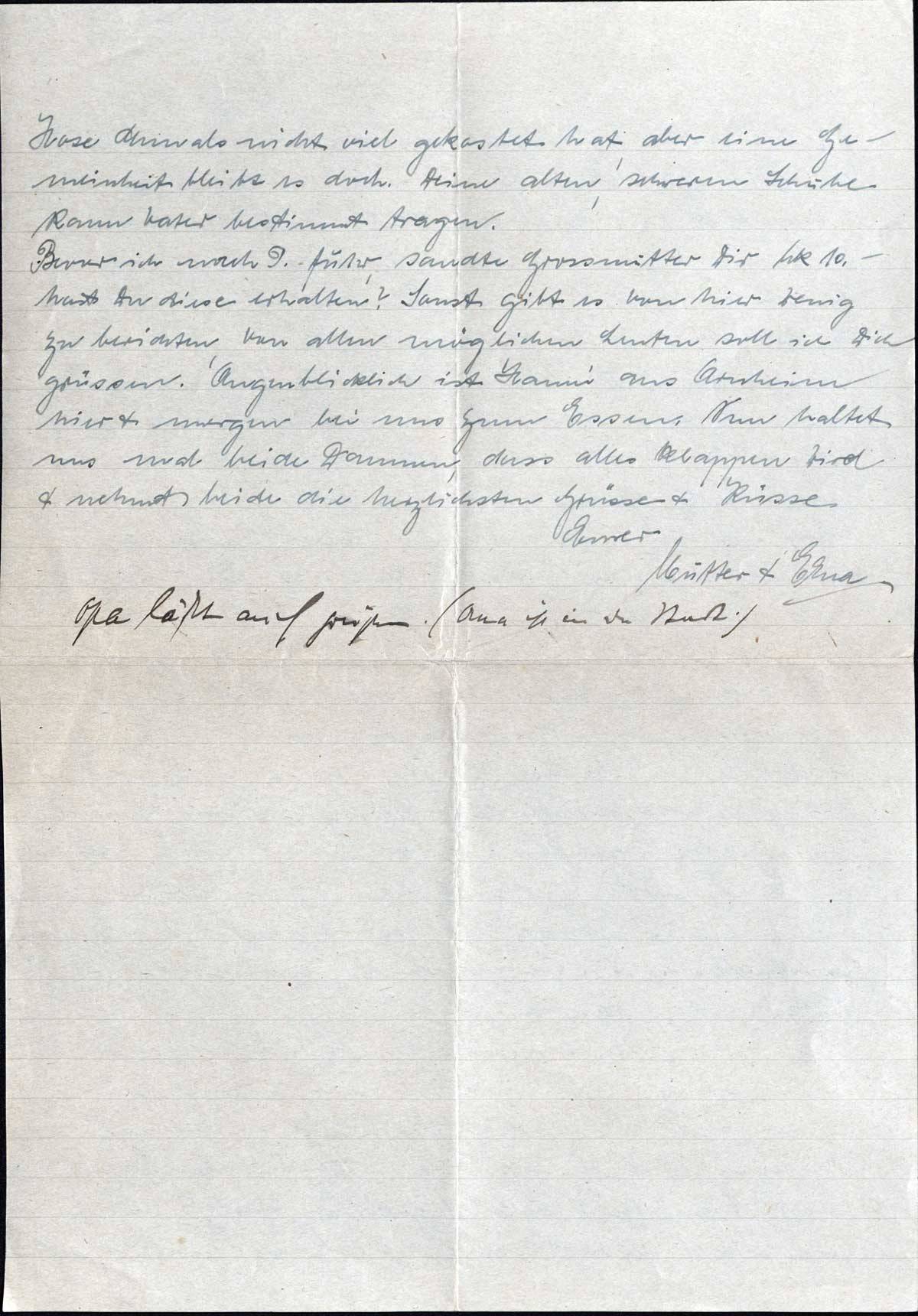 Bevor ich nach P. fuhr, sandte Grossmutter Dir Mk 10.- hast Du diese erhalten? Sonst gibt es von hier wenig zu berichten, von allen möglichen Leuten soll ich Dich grüssen. Augenblicklich ist Hanni aus Arnheim hier & morgen bei uns zum Essen. Nun haltet uns mal beide Daumen, dass alles klappen wird & nehmt beide die herzlichsten Grüsse & Küsse