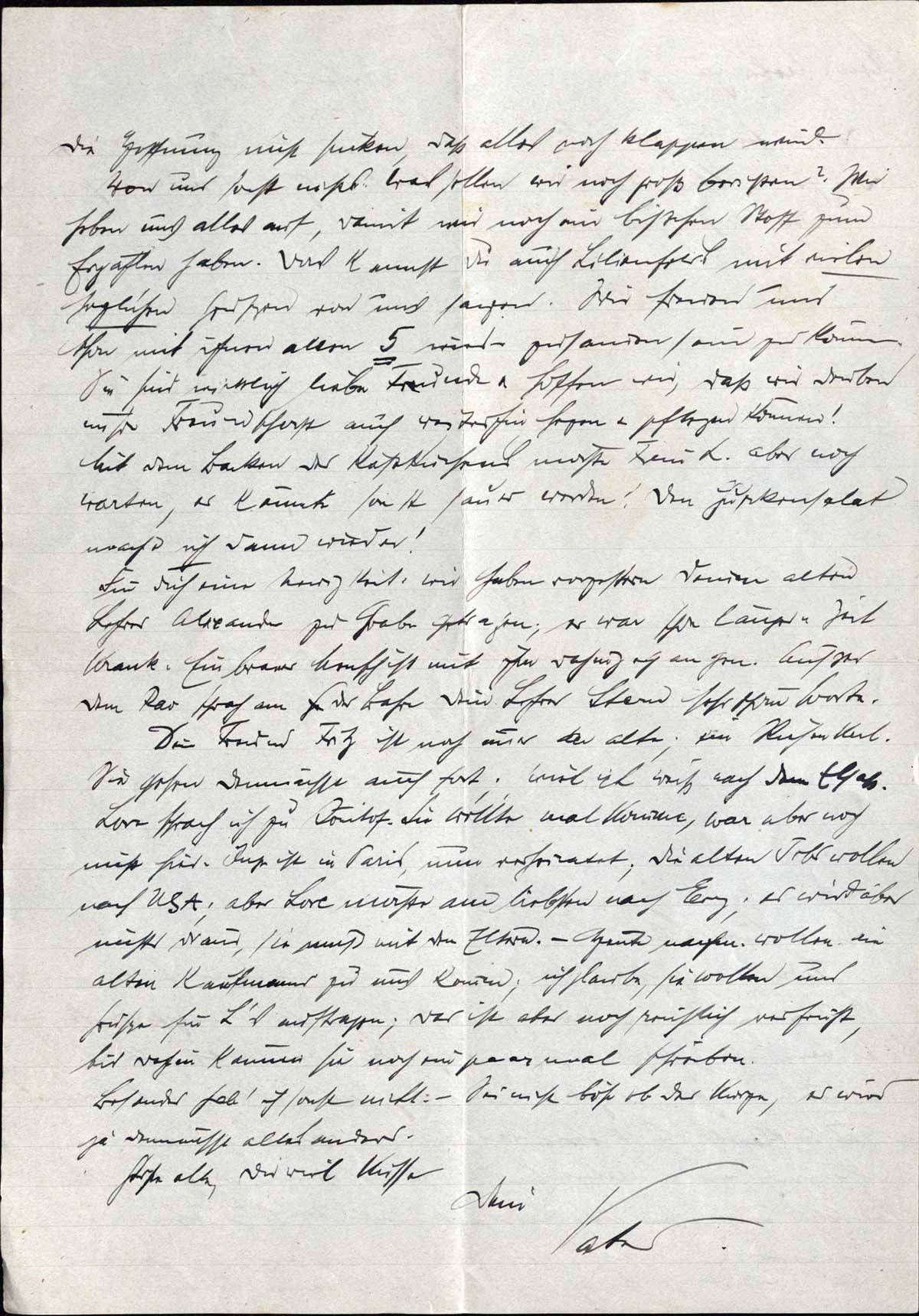 Für Dich eine Neuigkeit: wir haben vorgestern Deinen alten Lehrer Alexander zu Grabe getragen; er war schon längere Zeit krank. Ein braver Mensch ist mit ihm dahingegangen. Außer dem Rav sprach an der Bahre Dein Lehrer Stern sehr schöne Worte.
