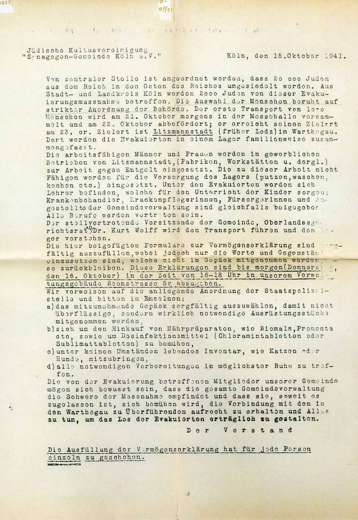 „Synagogen-Gemeinde Köln e.V.” Köln, den 15. Oktober 1941.