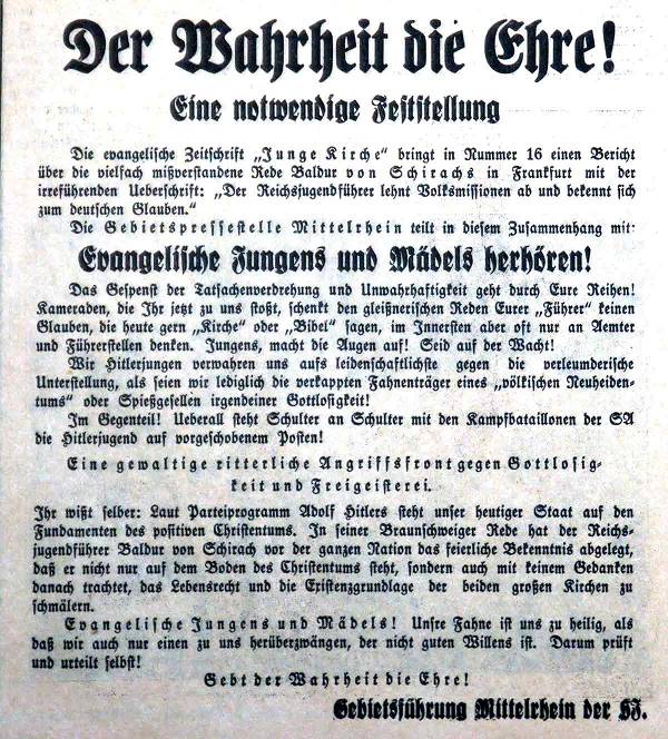 Baldur von Schirach habe klargestellt, dass er auf dem "Boden des Christentums" stehe und keinesfalls das "Lebensrecht und die Existenzgrundlage der beiden großen Kirchen zu schmälern".