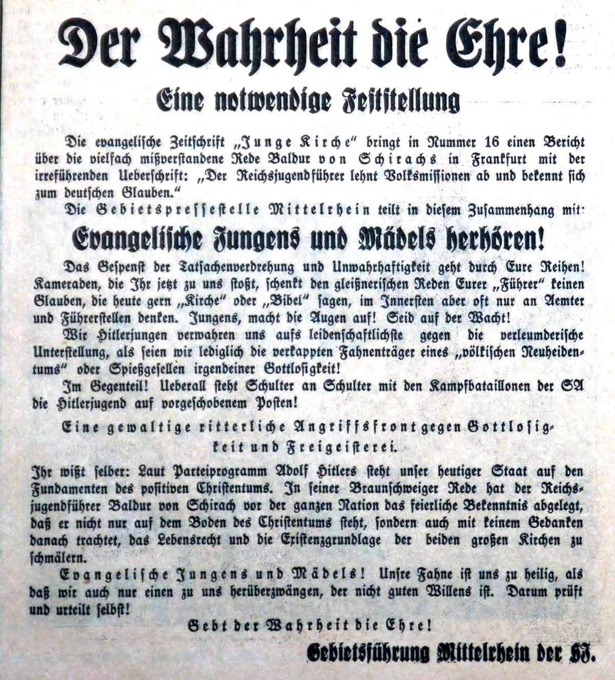 Die HJ verwahre sich dageben, als "verkappte Fahnenträger eines völkischen Neuheidentums" oder "Spießgesellen irgendeiner Gottlosigkeit" zu gelten. Vielmehr bilde sie eine "gewaltige ritterliche Angriffsfront gegen Gottlosigkeit und Freigeisterei".