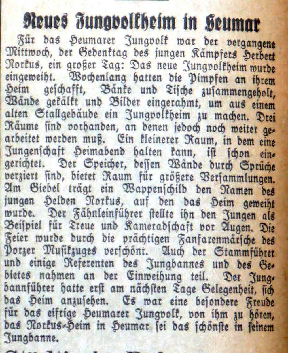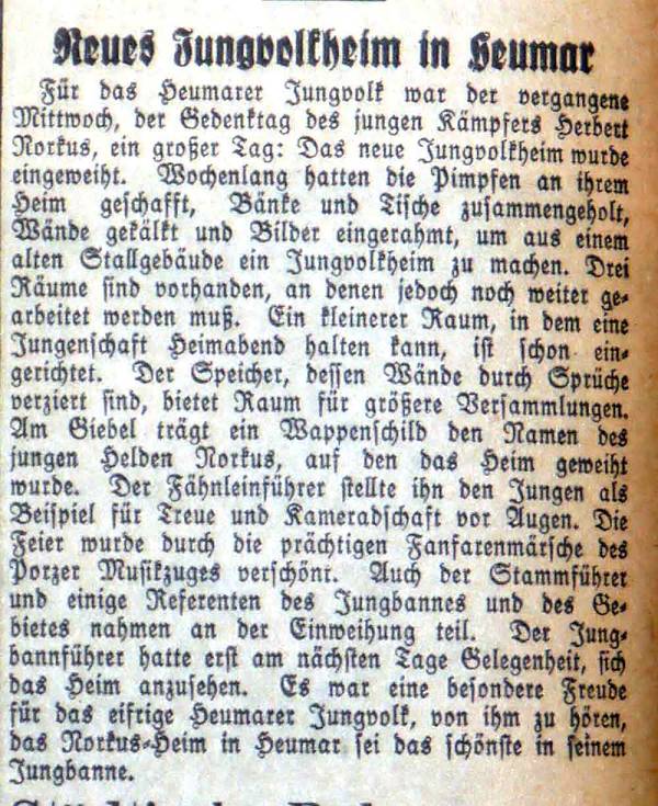 Am Gedenktag für Herbert Norkus wird in Heumar (heute ein Stadtteil von Köln) ein neues Jungvolkheim eingeweiht, das von den Mitgliedern des dortigen Jungvolks in Eigenarbeit eingerichtet und renoviert worden ist. Das Heim wird auf den Namen von Norkus getauft.