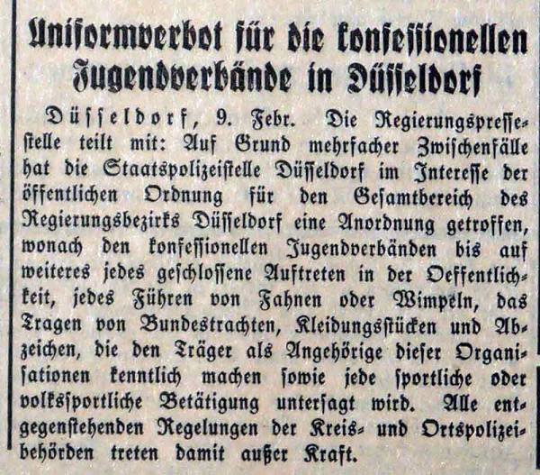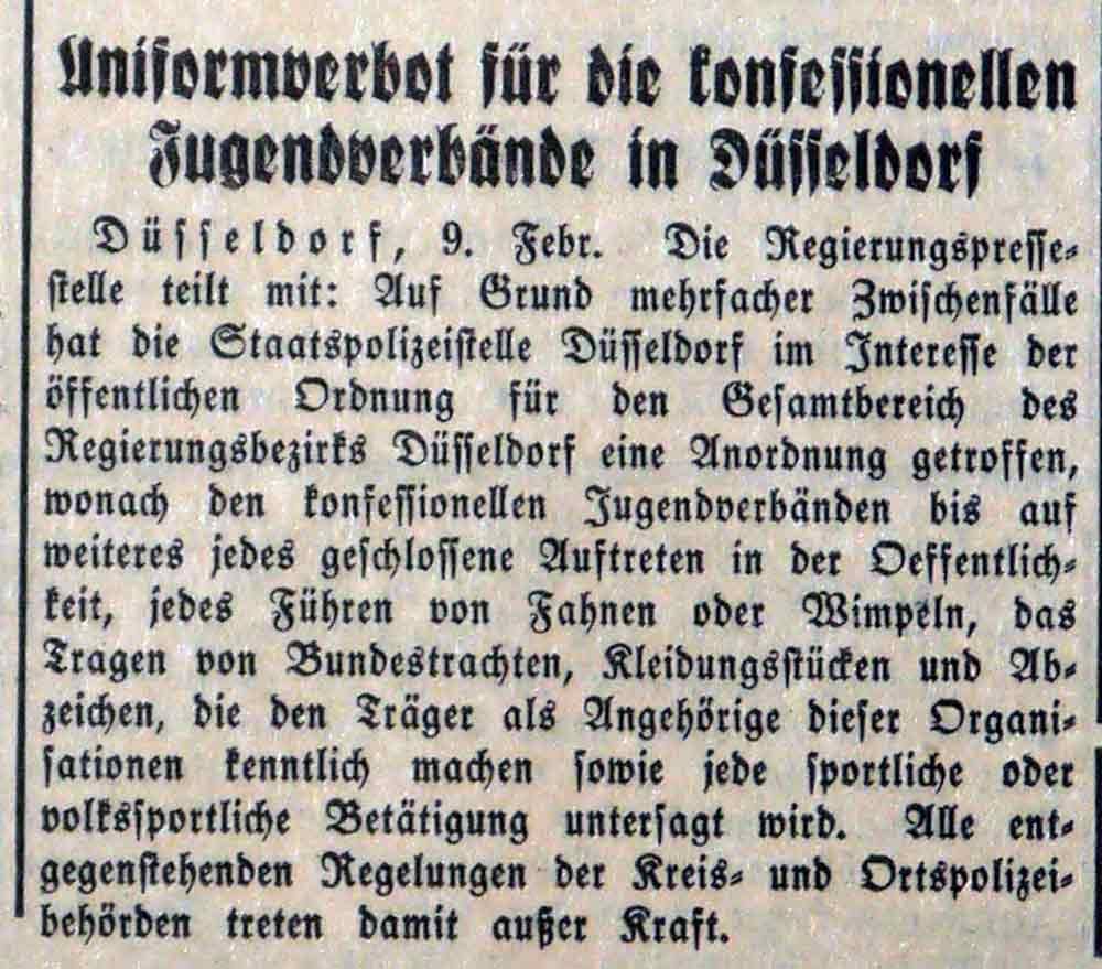 Die Regierungspressestelle in Düsseldorf teilt am 9. Februar 1934 mit, dass die Staatspolizeistelle Düsseldorf "aufgrund mehrfacher Zwischenfälle ... im Interesse der öffentlichen Ordnung" für den Regierungsbezirk Düsseldorf ein Uniformverbot für die konfessionellen Jugendverbände erlassen hat. Sie dürfen überdies in der Öffentlichkeit nicht geschlossen auftreten und keine Fahnen oder Wimpel führen. Zudem sind ihnen alle sportlichen und "volkssportlichen" Betätigungen untersagt.