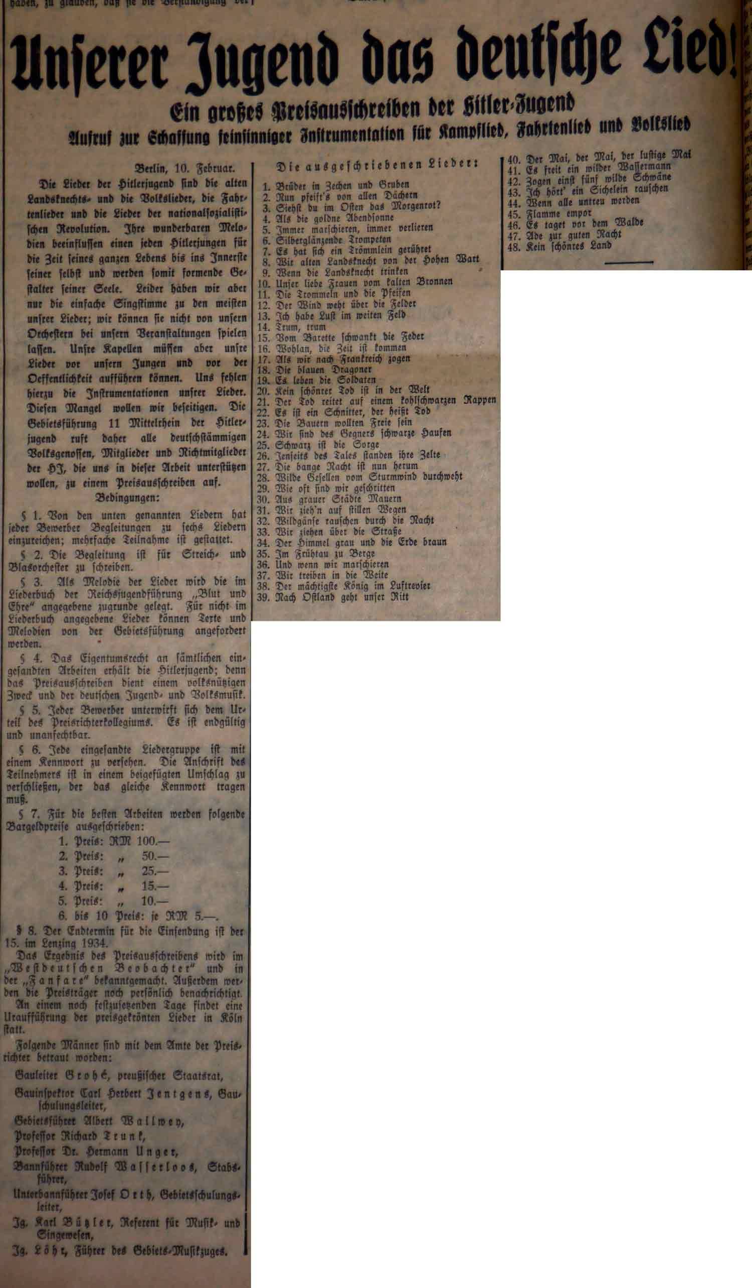 Das Gebiet Mittelrhein lobt am 10. Februar 1934 im Westdeutschen Beobachter einen Wettbewerb aus, bei dem die besten Instrumentationen von HJ-Liedern gekürt werden sollen. Die Bewerber sind aufgefordert, zu sechs Liedern aus einer beigefügten Liste von Kampf-, Fahrten- und Volksliedern Sätze für Blas- und Streichorchester zu schreiben und einzureichen. Das Eigentumsrecht der eingereichten Arbeiten soll an die HJ übergehen, da das Preisausschreiben einem "volksnützigem Zweck" diene.
