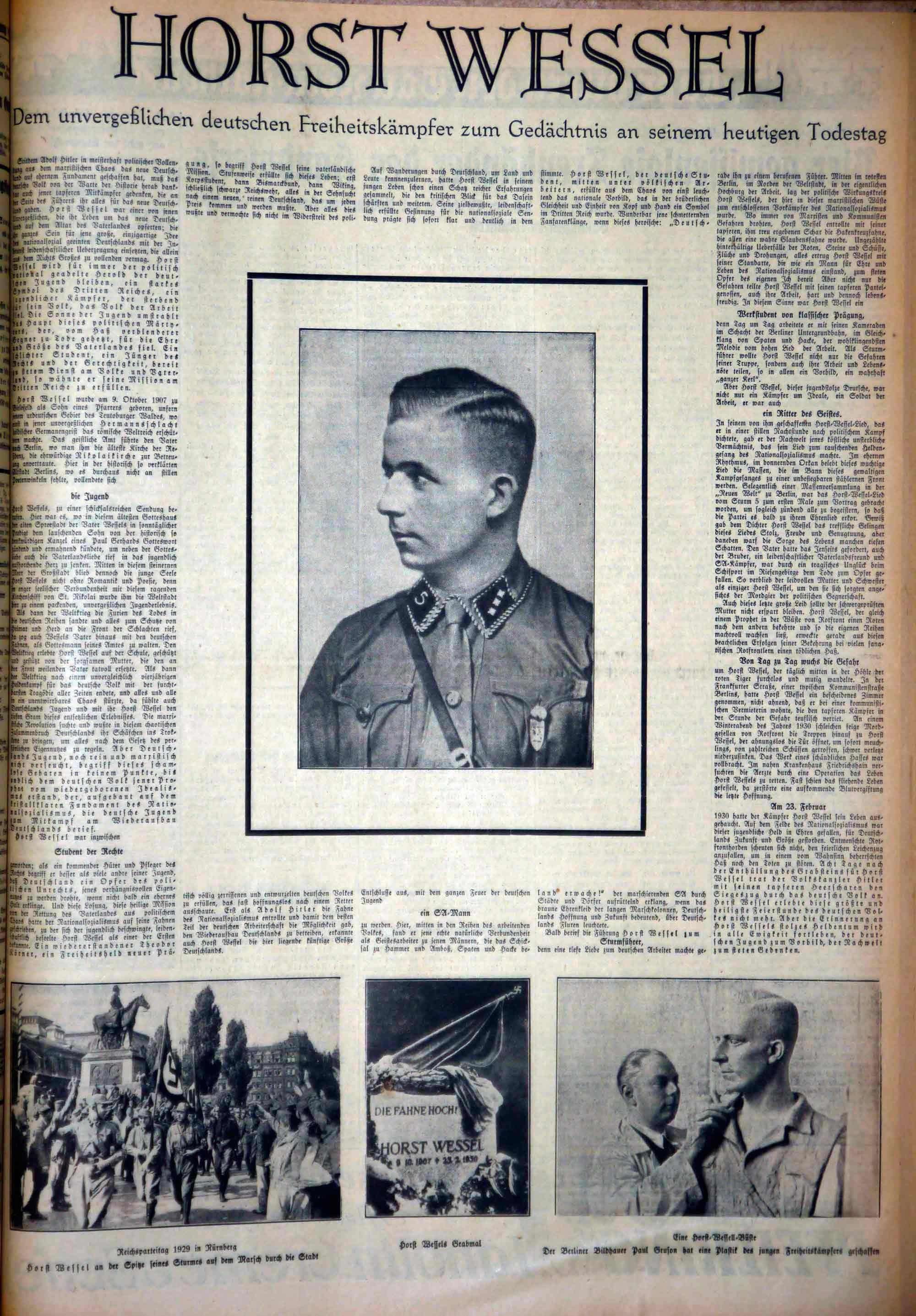 Anlässlich des Todestages von Horst Wessel bringt der Westdeutsche Beobachter am 23. Februar 1934 einen ganzseitigen Artikel, in dem Horst Wessel als "deutschem Freiheitskämpfer" gedacht wird.