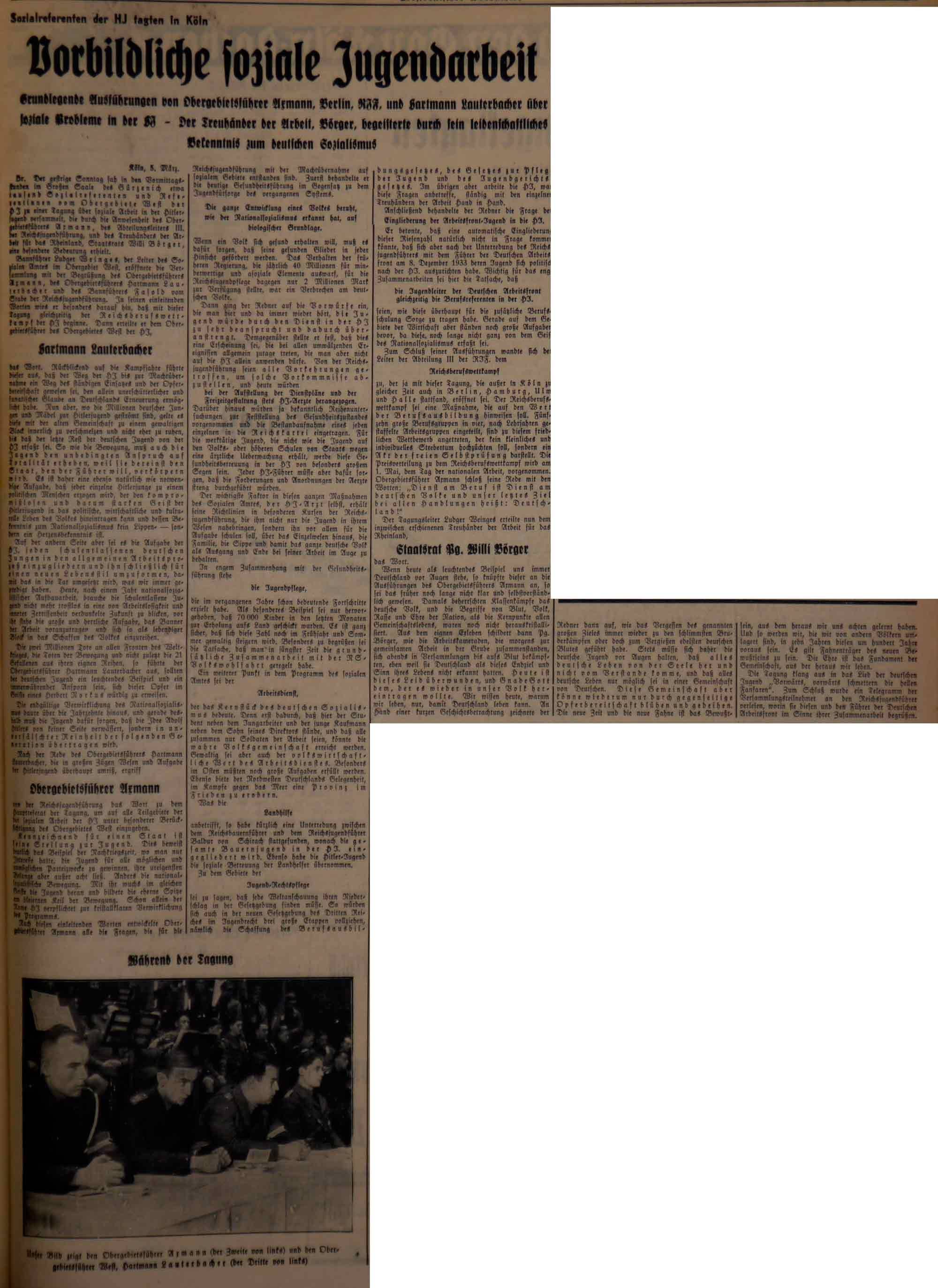 In Köln tagen am 3. und 4. März 1934 rund tausend Sozialreferenten und -referentinnen aus dem Obergebiet West. An der Tagung nehmen auch der Abteilungsleiter III der RJF, Axmann, und der Treuhänder der Arbeit für das Rheinland, Staatsrat Willi Börger, teil.