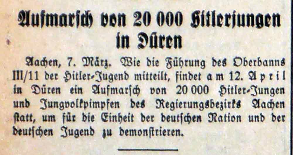 In Düren findet am 12. April 1934 ein Aufmarsch von 20.000 Mitgliedern von HJ und Jungvolk des Regierungsbezirks Aachen statt, um die "Einheit der deutschen Nation und der deutschen Jugend zu demonstrieren".