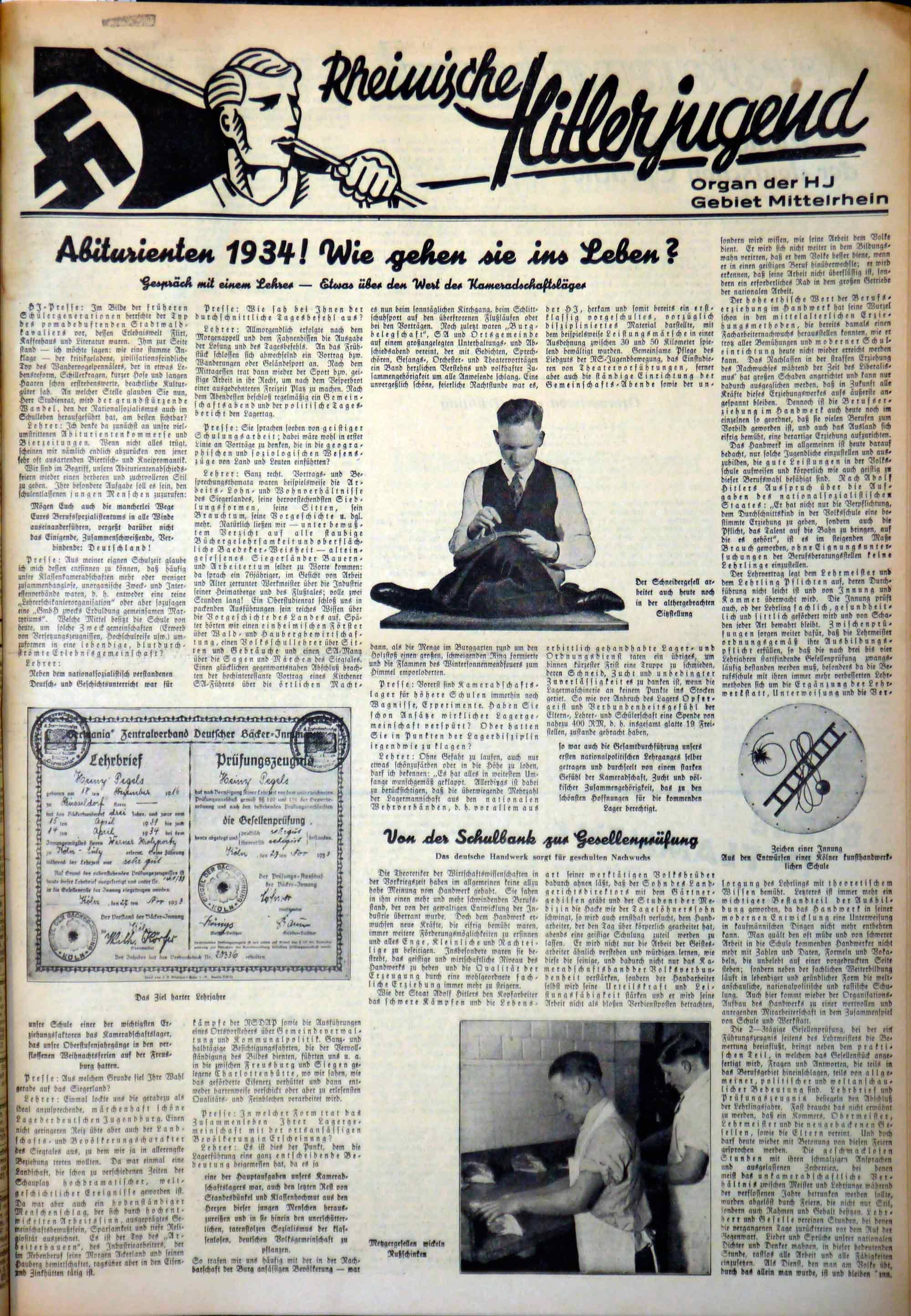 In der HJ-Beilage des Westdeutschen Beobachters, "Rheinische Hitlerjugend", wird am 28. März 1934 ein Interview mit einem Lehrer gebracht, in dem eine neue Form der nationalsozialistischen Erziehung an höheren Schulen vorgestellt. In sogenannten "Kameradschaftslagern", die alle Merkmale der nationalsozialistischen Lagererziehung wie Morgenappell, Sport und Schulungen aufweisen, sollen die Schüler im Sinne der nationalsozialistischen Volksgemeinschaftsideologie erzogen werden und ihnen der letzte "Rest von Standesdünkel und Klassenhochmut aus den Herzen" gerissen werden.
