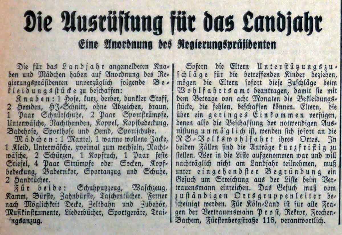Der Kölner Regierungspräsident veröffentlicht am 30. März 1934 eine Liste für die Ausrüstung, die von den Teilnehmerinnnen und Teilnehmern des Landjahres mitzunehmen ist. Eine einheitliche Kleidung ist dabei nicht vorgeschrieben, nur bei den Jungen sollen die beiden mitzunehmenden Hemden braun und die kurze Hose dunkel sein.