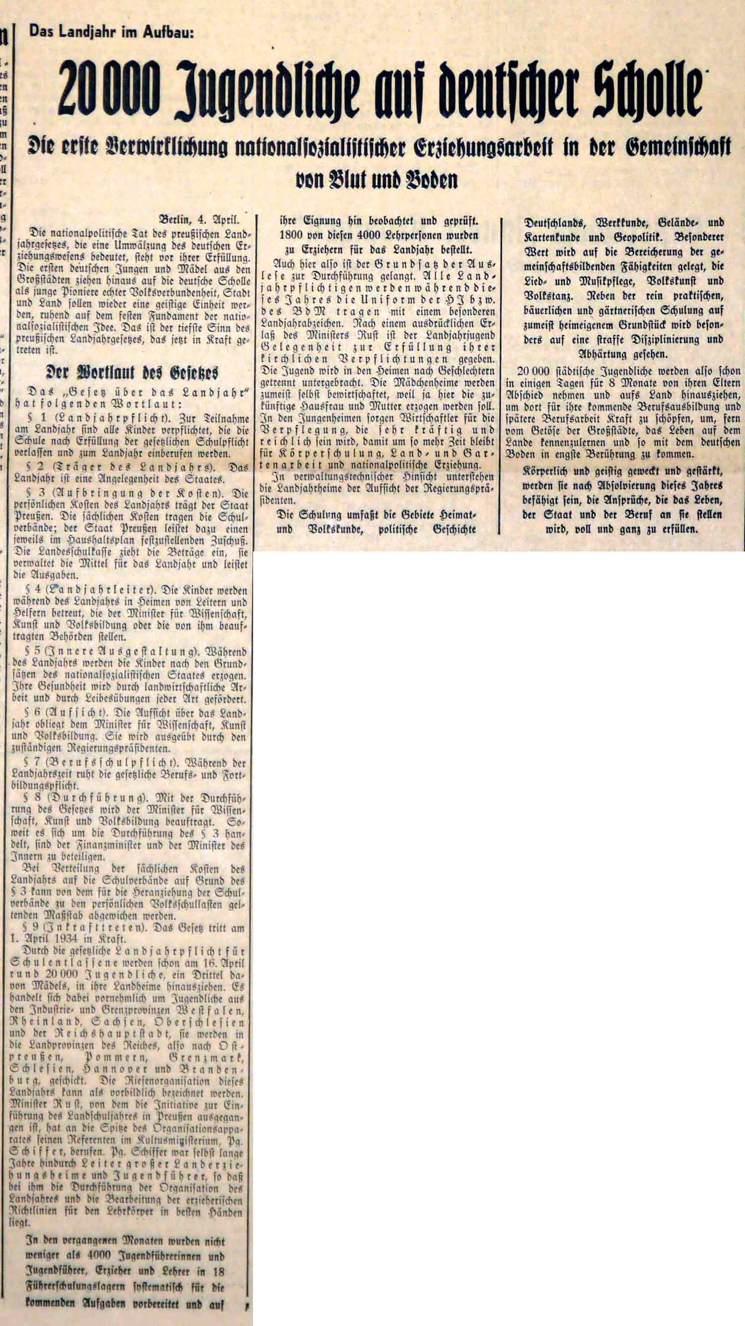 Um die seelische Verbundenheit der schulentlassenen Stadtjugend mit Heimat und Volkstum und das verständnis für den völkischen Wert gesunden Bauerntums zu vertiefen, hat das Staatsministerium das folgende Gesetz beschlossen:
