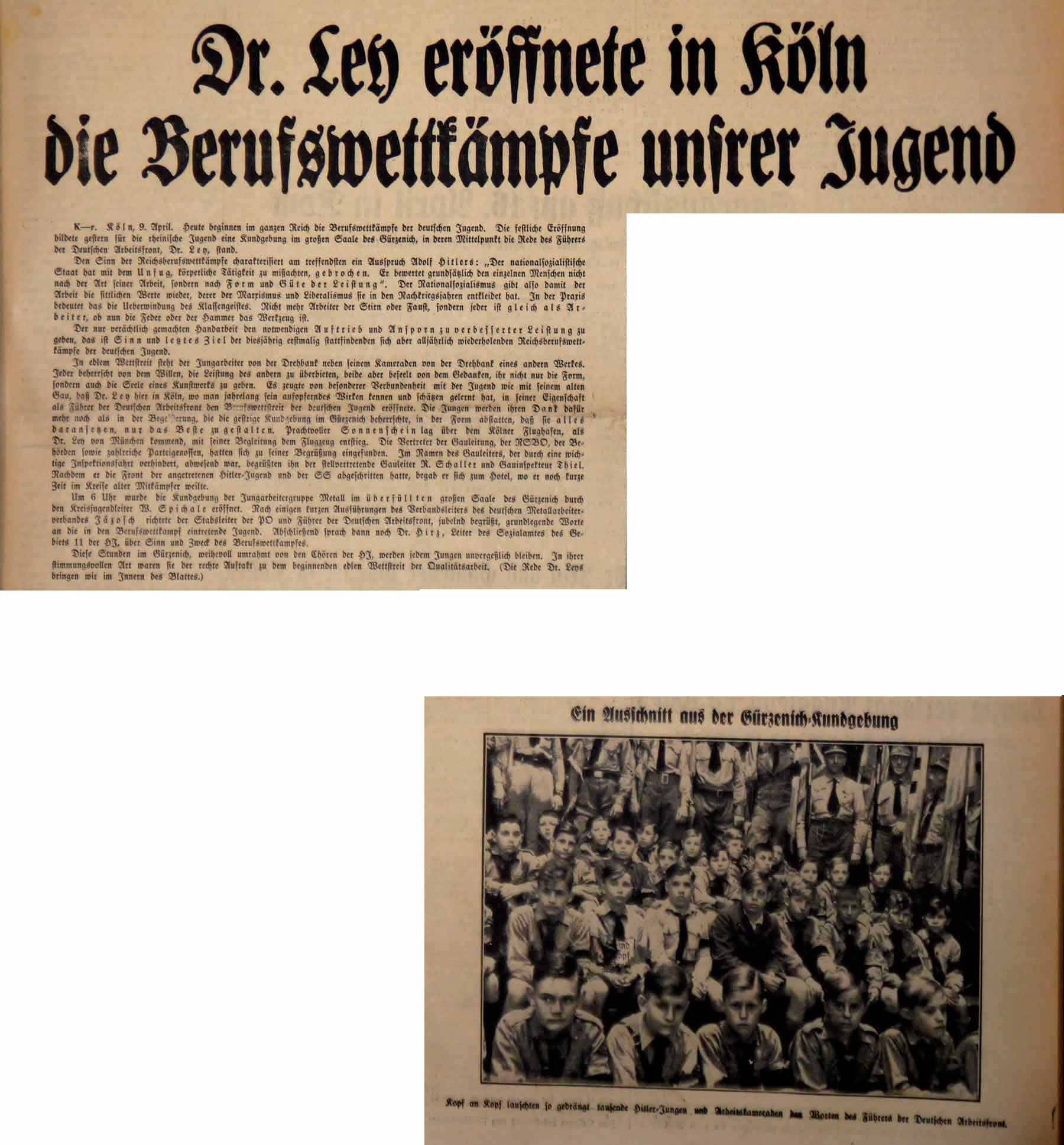 Der Reichsberufswettkampf wird im Rheinland am 8. April 1934 durch eine große Feier im Kölner Festsaal Gürzenich eröffnet. Die Eröffnungsrede hält der Führer der DAF, Dr. Ley, dessen politische Laufbahn mehrere Jahre mit Köln verbunden war. Die Kundgebung wird von den Chören der HJ umrahmt.