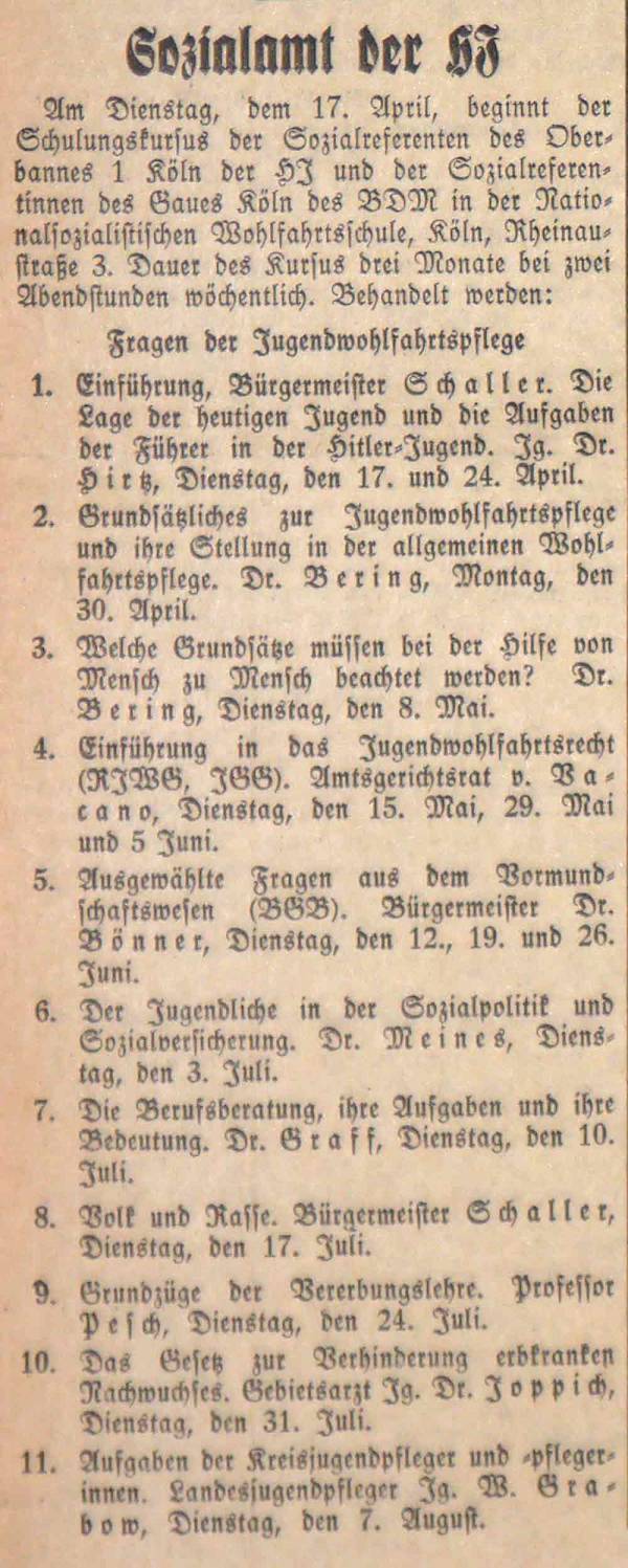 In einem dreimonatigen Kursus werden die Sozialreferenten des Oberbannes 1 Köln und die Sozialreferentinnen des Gaues Köln in der Nationalsozialistischen Wohlfahrtsschule Köln ab dem 17. April 1934 geschult. In wöchentlich zwei Abendstunden hören sie Vorträge u.a. zur Jugendwohlfahrtspflege, zum Jugendwohlfahrtsrecht, zum Vormundschaftswesen, zu Sozialpolitik und Berufsberatung, zu den Aufgaben von Kreisjugendpflegern und -pflegerinnen sowie zu rassenideologischen Themen wie dem Gesetz zur Verhinderung erbkranken Nachwuchses.