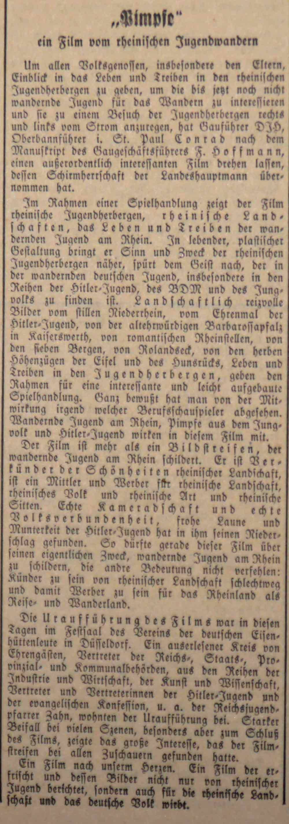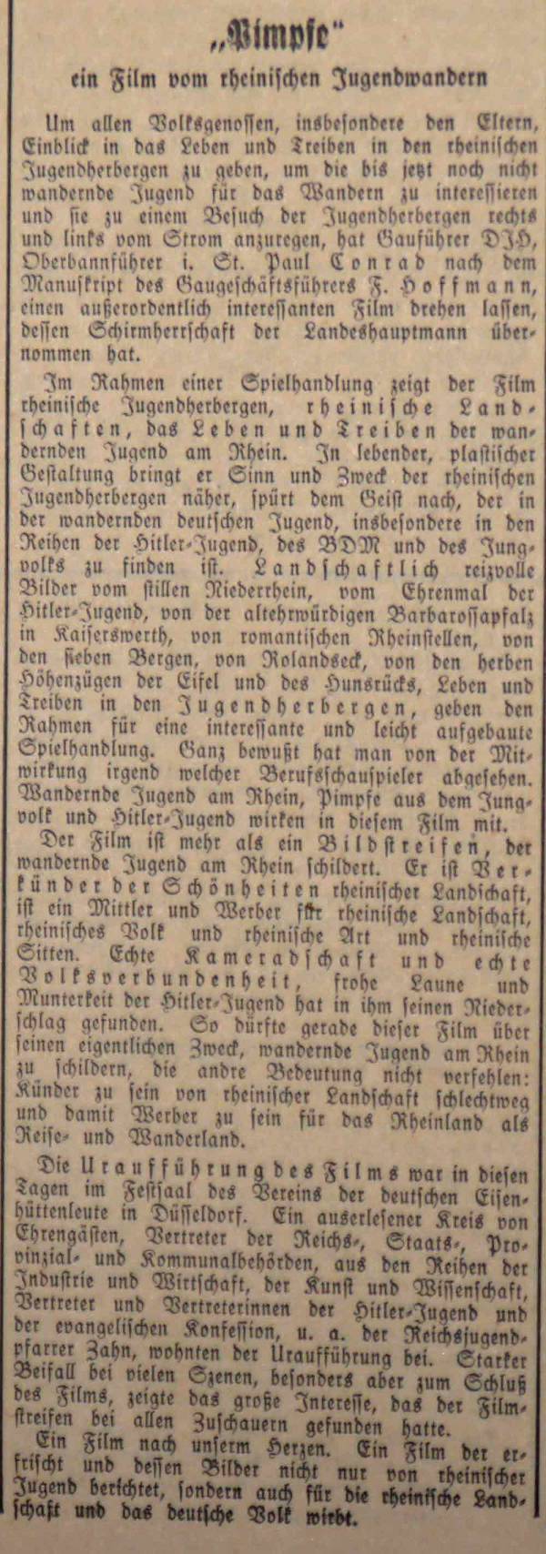 Im April 1934 findet im Festsaal des Vereins der deutschen Eisenhüttenleute in Düsseldorf die Uraufführung des Filmes "Pimpfe" statt. Der Film soll nach Angaben des Westdeutschen Beobachters Eltern Einblick in das Leben der rheinischen Jugendherbergen geben und darüber hinaus die noch nicht wandernde Jugend zu Ausflügen in das rheinische Umland einladen. Der Propagandafilm wurde vom Gauführer des DJV. Oberbannführer i.R. Paul Conrad nach dem Manuskript des Gaugeschäftsführers F. Hoffmann in Auftrag gegeben.