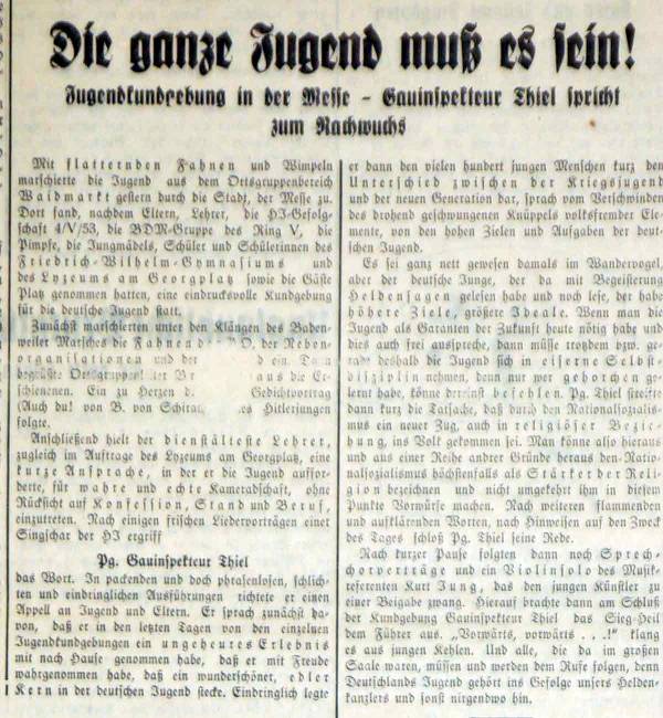 Als Hauptredner lobt Gauinspektor Thiel vor den anwesenden Jugendlichen und Eltern die Ziele und Ideale der HJ und ihre "eiserne Selbstdisziplin". Denn nur wer gehorchen gelernt habe, könne auch befehlen.