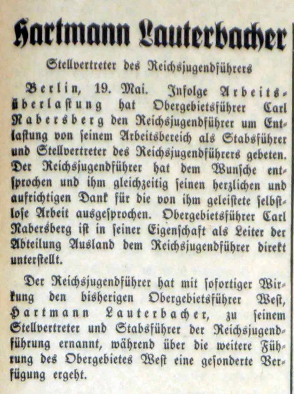 Der Führer des Obergebietes West, Hartmann Lauterbacher, wird am 19. Mai 1934 Stellvertreter und Stabsführer von Reichsjugendführer Baldur von Schirach. Er tritt die Nachfolge von Carl Nabersberg an, der wegen Arbeitsüberlastung um Entlastung von diesem Arbeitsbereich gebeten hatte und fortan die Abteilung Ausland in der Reichsjugendführung übernimmt.