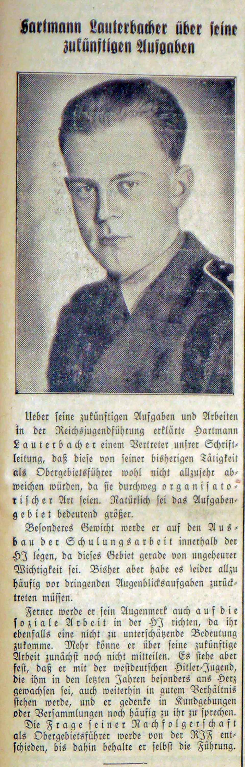 Über seine neue Aufgabe sagt Lauterbacher in einem Gespräch mit dem Westdeutschen Beobachter, dass sie hauptsächlich organisatorischer Art sei. Ein besonderes Augenmerk werde er dabei auf den Aufbau von Schulungsarbeit und sozialer Arbeit legen