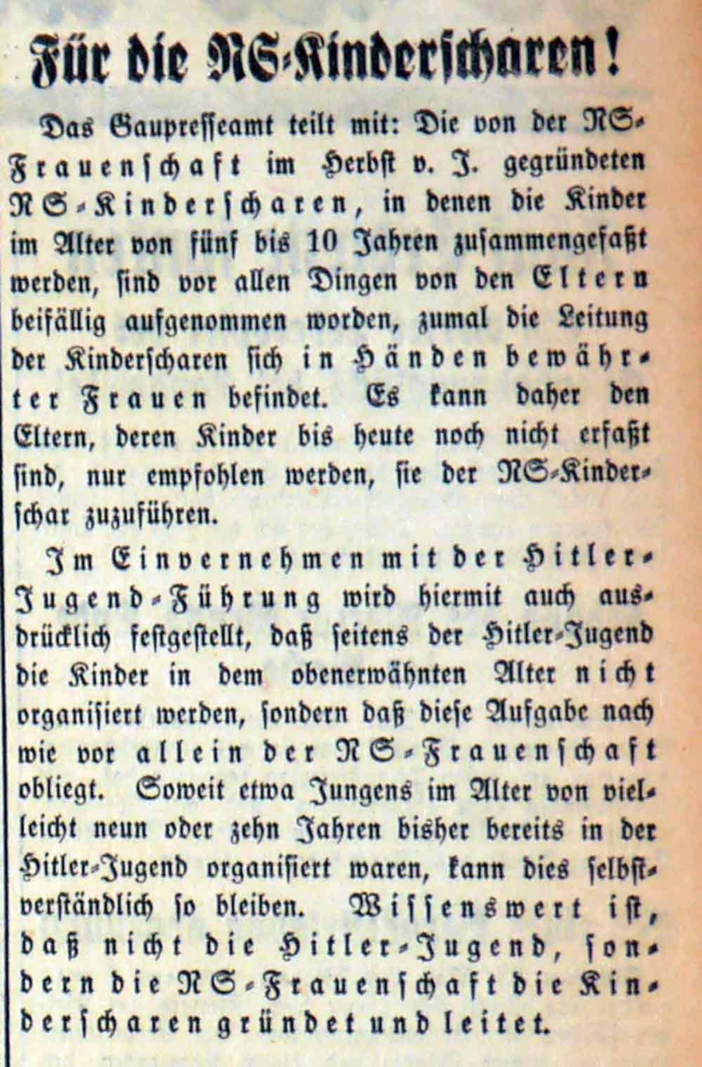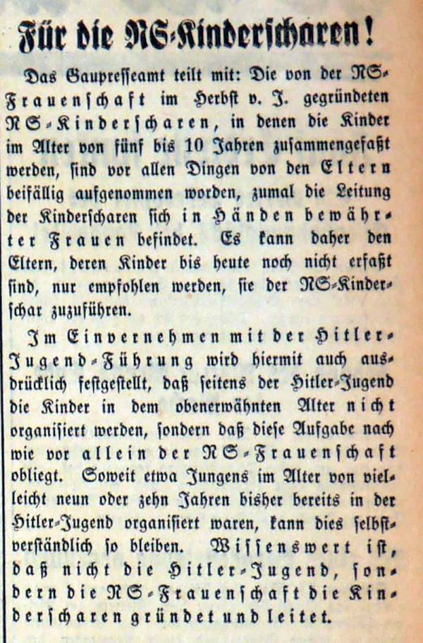 Im Herbst 1933 werden von der NS-Frauenschaft für fünf- bis zehnjährige Kinder NS-Kinderscharen ins Leben gerufen. Dazu veröffentlicht die HJ im Mai 1934 im Westdeutschen Beobachter den Hinweis, dass Kinder in dem Alter ausdrücklich nicht in der HJ organisiert werden. Eine Ausnahme bilden Fälle, in denen neun- bis zehnjährige Jungen bereits Mitglied in der HJ sind.