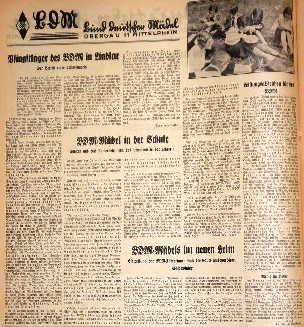 Zu Pfingsten 1934 führt der BDM des Obergaues 11 Mittelrhein in Lindlar, Königswinter, Eitorf, Monschau und auf dem Venusberg Lager durch, die vor allen denjenigen Mädchen, die "jahrelang nicht aus der Großstadt und aus den Industriegebieten herausgekommen sind" einige Tage "Leben in gesunder Luft, in Sonne, zwischen Wäldern und Feldern" ermöglichen sollen.