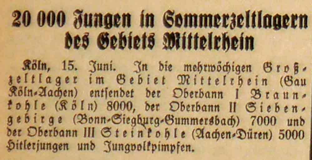 Für Juli und August sind weitere zehn Zeltlager der Banne und Jungbanne geplant, an denen rund 25.000 Jungen vier Wochen lang "an Köprer und Geist im nationalsozialistischen Sinne geschult werden".