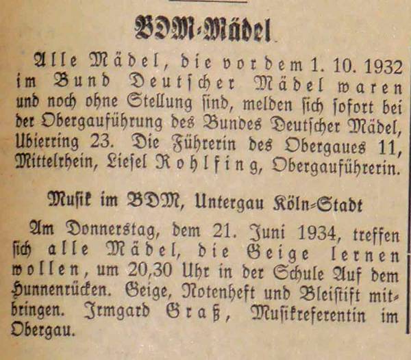 Für den Untergau Köln-Stadt bietet die Musikreferentin im Obergau, Irmgard Graß, ab dem 21. Juni 1934 in der Schule Auf dem Hunnenrücken Geigenunterricht an.