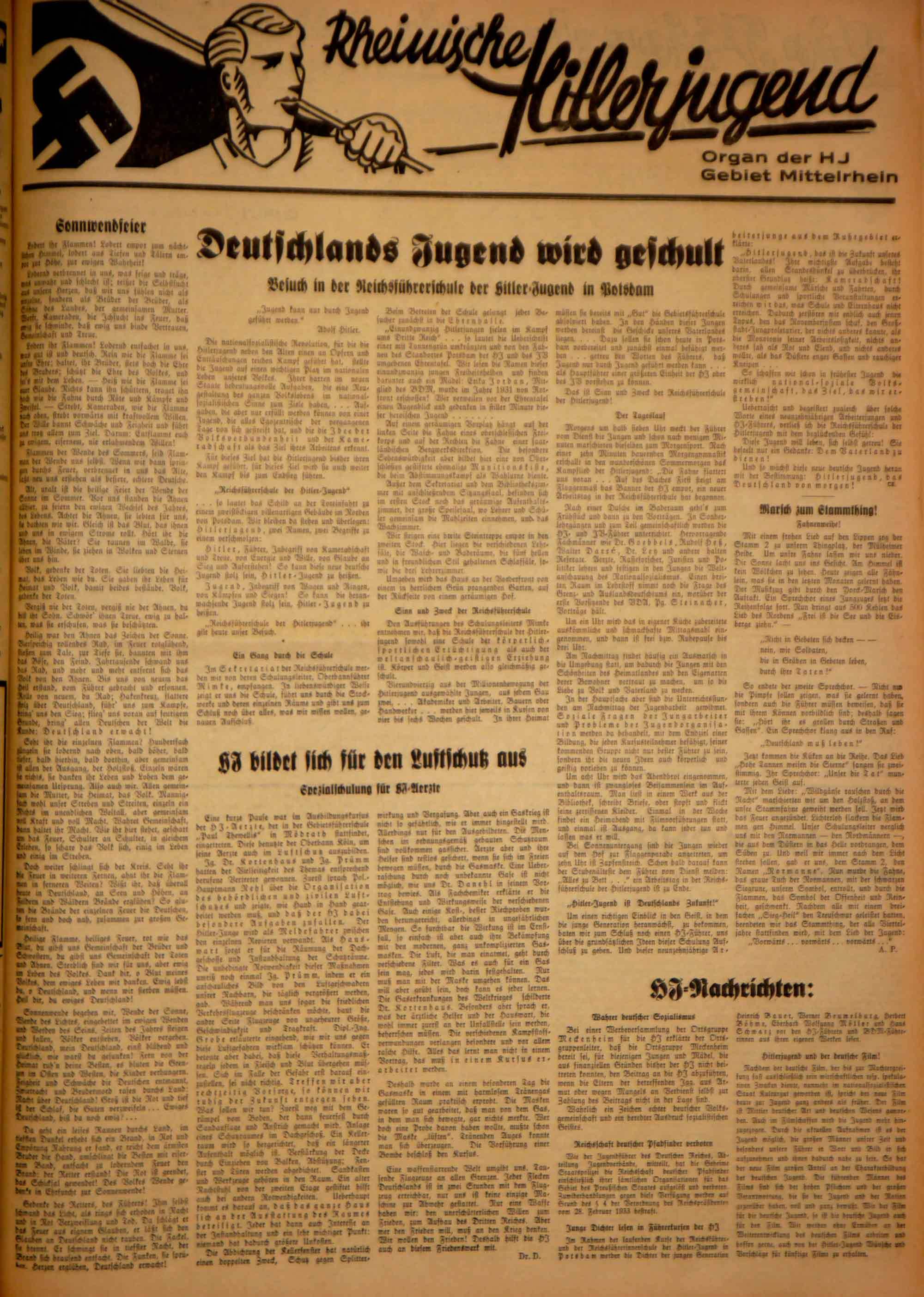 In der HJ-Beilage des Westdeutschen Beobachters, "Rheinische Hitlerjugend" erscheint am 20. Juni 1934 ein Artikel über einen Besuch in der Reichsführerschule in Potsdam. Die Schule liegt in einem villenartigen Gebäude und bietet Platz für Kurse mit 24 Teilnehmern. Die Teilnehmer, die alle bereits einen Kursus in einer Gebietsführerschule mit "gut" bestanden haben müssen, werden vier bis sechs Wochen lang körperlich und ideologisch geschult. Referenten sind u.a. Goebbels, Hess, Darré und Ley.