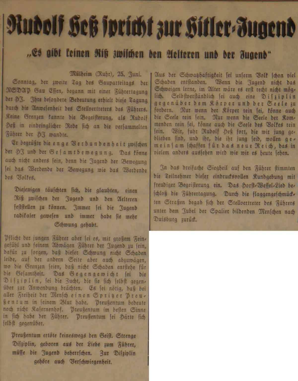 Am zweiten Tag des Gauparteitages der NSDAP in Essen findet am 24. Juni 1934 eine HJ-Führertagung statt, auf der auch Hitlers Stellvertreter Hess spricht. Dabei mahnt er, den "Schwung" der Jugend zwar auf der einen Seite zu fördern, auf der anderen Seite aber auch durch "Disziplin" zu begrenzen, damit kein Schade für die Gesamtheit der "Bewegung" entstehe. Der Mensch müsse bei aller Freiheit einen "Spritzer Preußentum" in seinem Blut haben. Preußentum aber sei "Härte sich selbst gegenüber". Die alte, doch jung gebliebene Generation müsse gemeinsam mit den Jungen "das neue Reich" schaffen.