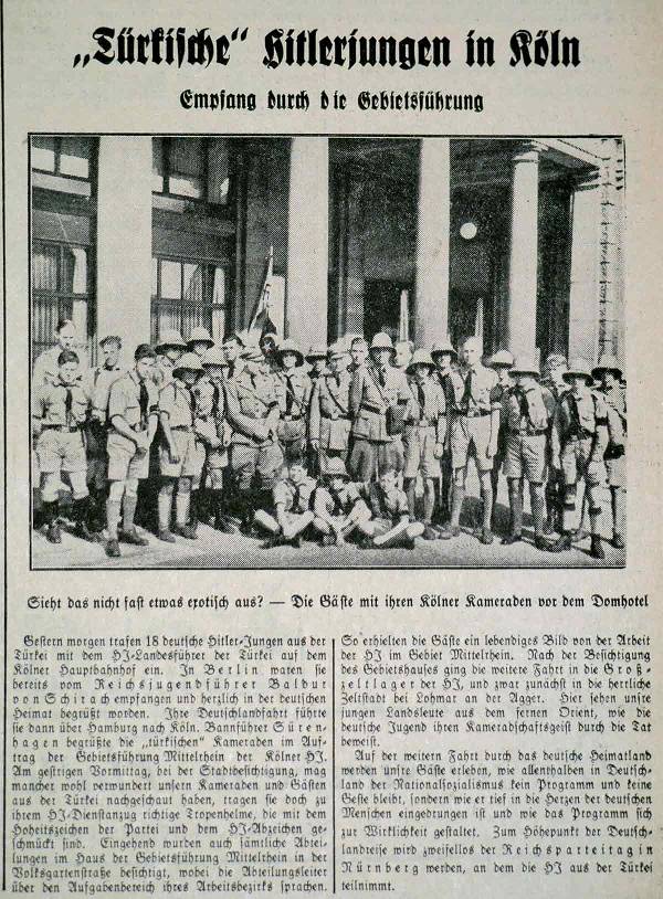 Am 6. August 1934 ist eine Abordnung der HJ aus der Türkei zu Besuch in Köln. Zu ihrer Uniform tragen die Jungen einen Tropenhelm.