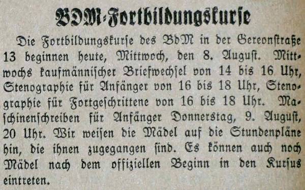 Am 8. August 1934 beginnen in Köln die Fortbildungskurse des BDM in den Bereichen kaufmännischer Briefwechsel, Stenographie und Maschinenschreiben.