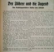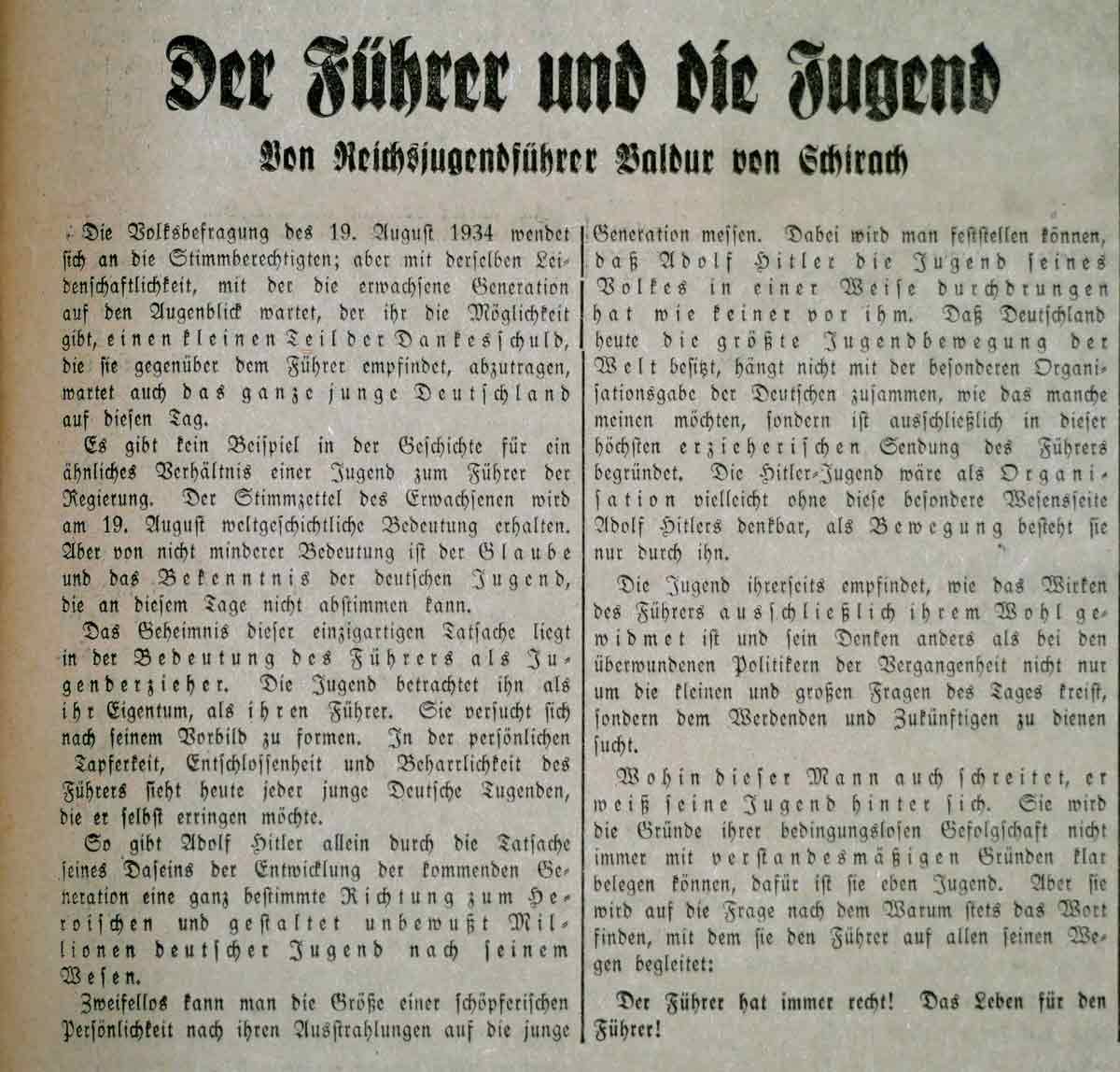 Auch Baldur von Schirach meldet sich wegen der Volksabstimmung zu Wort und betont, dass das Wirken des "Führers" ausschließlich dem Wohl der Jugend gewidmet sei und dem "Werdenden und Zukünftigen zu dienen" suche: "Der Führer hat immer recht! Das Leben für den Führer!"