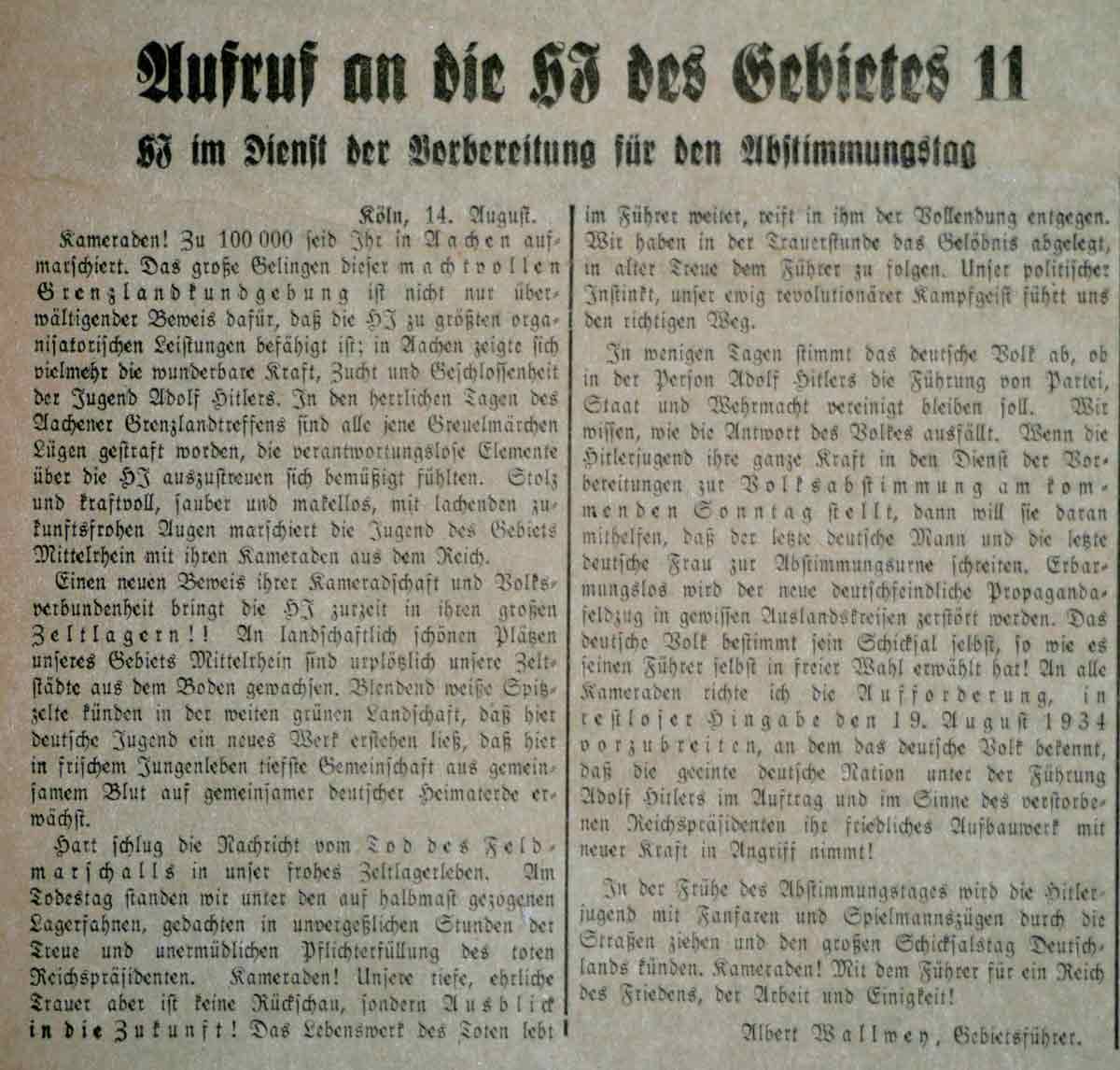 Der Führer des Gebietes Mittelrhein, Albert Wallwey, fordert in einem Artikel im Westdeutschen Beobachter am 14. August 1834, dass die HJ "ihre ganze Kraft in den Dienst der Vorbereitungen zur Volksabstimmung" einsetzt und dazu beiträgt, dass "der letzte deutsche Mann und die letzte deutsche Frau zur Abstimmungsurne schreiten". Am 19. August 1934 wird nach dem Tod von Hindenburg darüber abgestimmt, ob "in der Person Hitlers die Führung von Partei, Staat und Wehrmacht vereinigt bleiben soll".