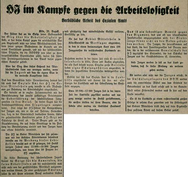 Die HJ im Gebiet Mittelrhein habe sich gemeinsam mit den örtlichen Arbeitsämtern besonders stark um die Werbung dieser Lehrstellen bemüht und es sei gelungen, seit Herbst 1933 etwa 15.000 bis 16.000 Jungen unterzubringen, von denen über 50 Prozent der HJ angehörten.