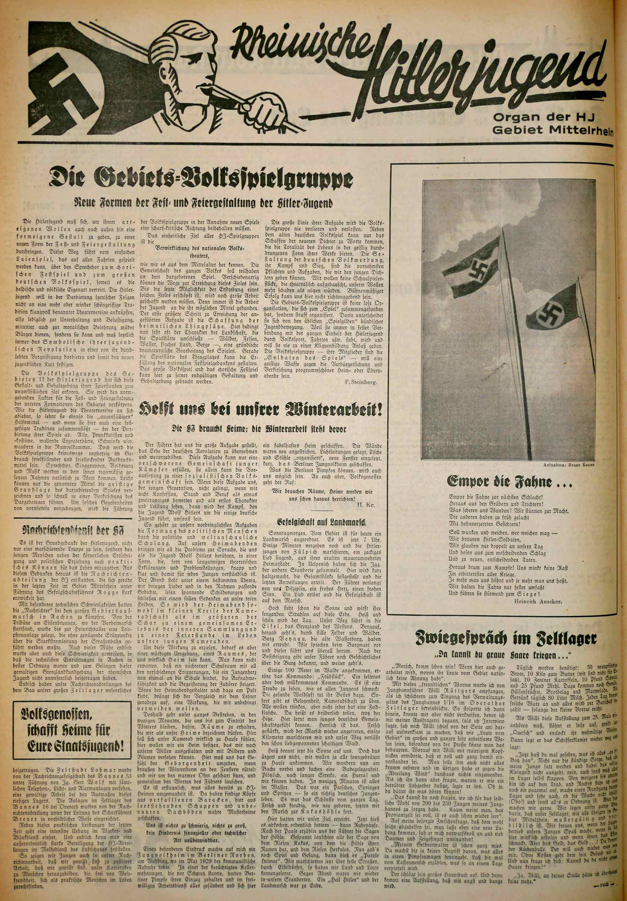 Bei allen großen Veranstaltungen der HJ kümmert sich ein eigener "Nachrichtendienst" um die Übertragung von Nachrichten und Reden. Im Gebiet Mittelrhein verlegt der Nachrichtendienst beispielsweise beim Gebietsaufmarsch in Aachen eine Telefonanlage, in der Zeltstadt in Lohmar kümmert sich die Nachrichtengefolgschaft des Bannes 53 unter Führung von Gert Wolf um sämtliche Telefon-, Licht- und Alarmanlagen, und im Lager in Overath geschieht das Gleiche durch die Nachrichtenabteilungen des Bannes 16 unter Leitung von Scharführer Breuer.