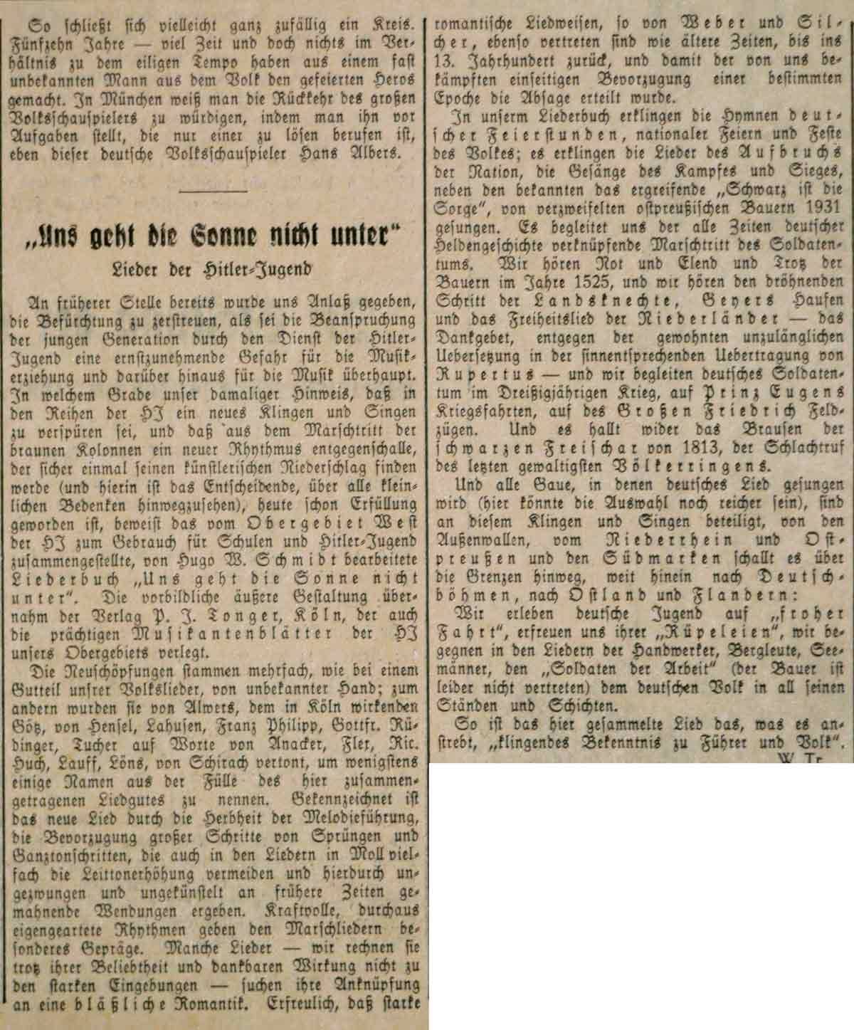 Am 31. August 1934 erscheint im Westdeutschen Beobachter eine Buchvorstellung des Liederbuches des Obergebietes West "Uns geht die Sonne nicht unter", das von der HJ für den Gebrauch in Schulen und HJ im Kölner Verlag Tonger herausgegeben und von Hugo W. Schmidt bearbeitet worden ist.