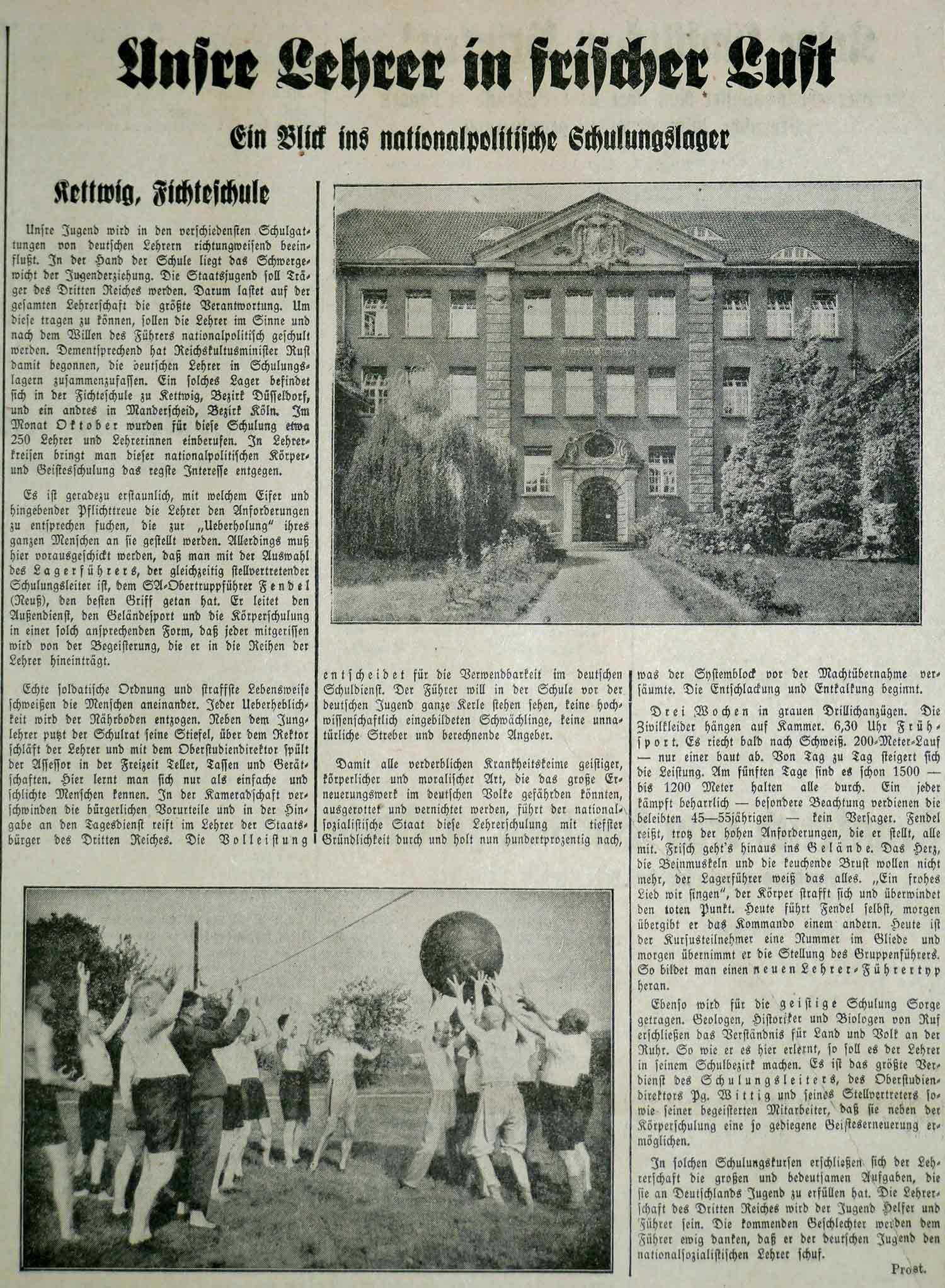 Um die Erziehung der "Staatsjugend" als "Träger des Dritten Reiches" zu unterstützen, also bei der Jugenderziehung mit der HJ am selben Strang zu ziehen, sollen Lehrer in besonderen Schulungslagern "nationalpolitisch" geschult werden. Im Bezirk Düsseldorf befindet sich ein solches Lager in der Fichteschule in Kettwig, im Bezirk Köln ein weiteres in Manderscheid.