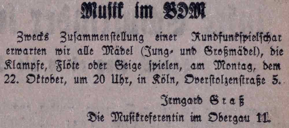 Zwecks Bildung einer Rundfunkspielschar ruft die Musikreferentin des Obergaues 11 Mittelrhein, Irmgard Graß, alle Mädchen, die Gitarre, Flöte oder Geige spielen, am 22. Oktober 1934 zu einem Treffen in die Overstolzenstraße 5 zu kommen.